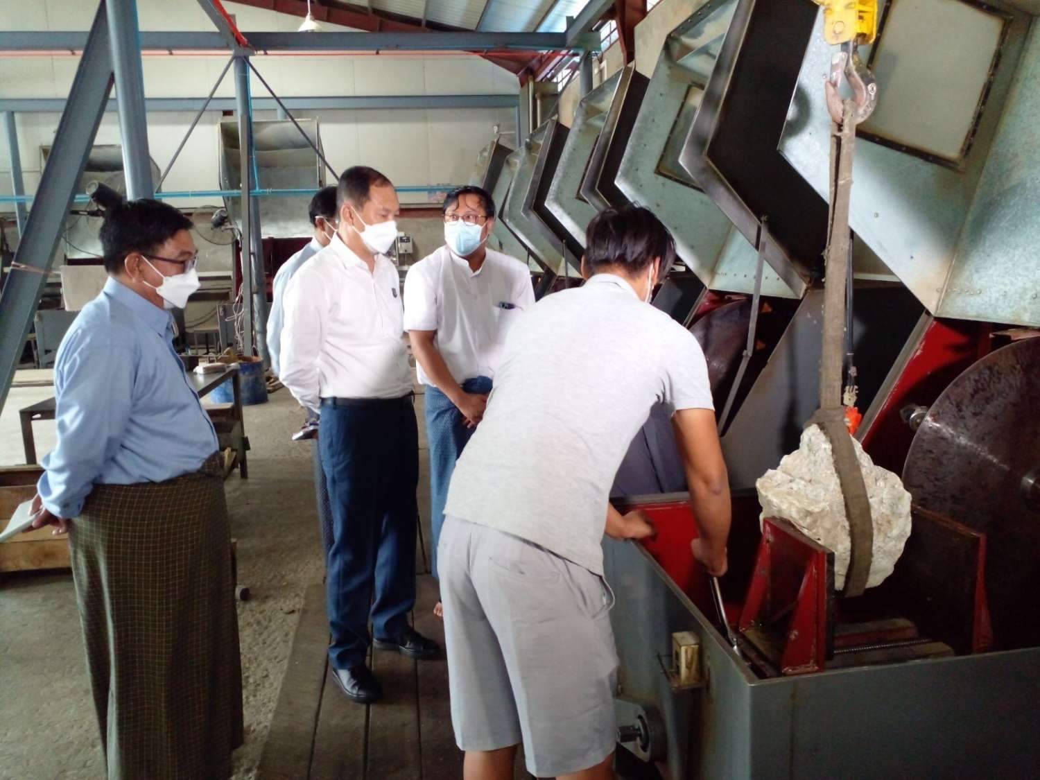 ထို့နောက် နေပြည်တော်၊ ရွှေကြာပင်ရှိ ကျောက်စိမ်းအချောထည်များ ထုတ်လုပ်နေသည့် ကျောက်မျက်ရတနာကုမ္ပဏီ၏ အလုပ်ရုံ၌ ကျောက်စိမ်းအရိုင်းများကို ဖြတ်တောက်ခြင်း၊ ဒီဇိုင်း ထုတ်လုပ်ခြင်း၊ ကွန်ပျူတာဖြင့် အသေးစိတ် ဒီဇိုင်းပုံဖော်ခြင်း၊ လက်ကောက်များ၊ လက်စွပ်များနှင့် ပုတီးစေ့များကို အကြမ်းထည်မှအရောင်တင် အချောထည် ထုတ်လုပ်ရရှိသည်အထိ လုပ်ငန်းဆောင်ရွက်မှု အဆင့်ဆင့်ကို လှည့်လည်ကြည့်ရှုခဲ့ပြီး နိုင်ငံပိုင် ကျောက်စိမ်းများထားရှိမှုကို ကြည့်ရှုစစ်ဆေးသည်။