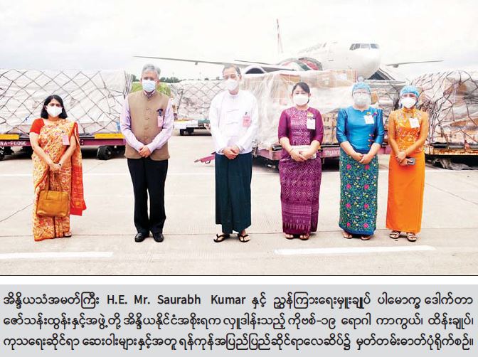 ကိုဗစ်-၁၉ ရောဂါ ကာကွယ်၊ ထိန်းချုပ်၊ ကုသရေးတွင် အသုံးပြု ရန် အိန္ဒိယနိုင်ငံအစိုးရက Long Surgical Glove (Elbow)size,5, 7 ၅၀၀၀၀ ၊ Examination Gloves ၁၅၀၀၊ Digital BP Cuff  ၅၇၀၊ Portable X-ray 100MA တစ်ခု၊ KN-95 Medical Mask (GP 19083) ၁၄၄၀၀ ၊ Rapid Antigen Test Kit ၂၀၀၀၊ High-flow nasal cannula (HFNC) ၁၀၀ ၊ Body Bed ၂၉၂ ခု ၊ PPE Coverall ၁၂၄၀ ၊ Pulse Oximeter (finger Tip) ၃၀၀၊ Oxygen Concentrator ၂၄ လုံး၊ Apron ၁၆၀၀ ၊ Empty Oxygen Cylinder (40-50) LTR အလုံး ၄၀၀ တို့ကို အိန္ဒိယနိုင်ငံ နယူး ဒေလီလေဆိပ်မှ ရန်ကုန်လေဆိပ်သို့ ပို့ဆောင်ခဲ့ခြင်းဖြစ်သည်။
