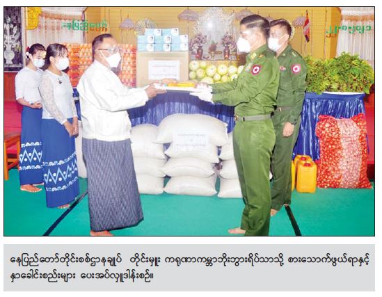 ကိုဗစ်- ၁၉ ရောဂါ ကာကွယ်၊ ထိန်းချုပ်၊ ကုသရေးလုပ်ငန်းများကို အရှိန်အဟုန်မြှင့် ဆောင်ရွက် လျက်ရှိရာ သွားလာမှုကန့်သတ်ချက်များကြောင့် စစ်မှုထမ်းဟောင်း အဖွဲ့ဝင်များ၊ မြန်မာနိုင်ငံ ရဲတပ်ဖွဲ့ဝင်များ၊ ပြည်သူ့စစ်(ဌာနေ)တပ်ဖွဲ့ဝင်များ၊ ကျန်းမာရေးဝန်ထမ်းများ၊ စေတနာ့ဝန်ထမ်း Volunteerများနှင့် ဒေသခံပြည်သူများ စားရေးအဆင်ပြေ စေရေးအတွက် တပ်မတော်နှင့် စေတနာရှင် အလှူရှင်များက စားသောက်ဖွယ်ရာများ၊ ထောက်ပံ့ငွေများနှင့် ရောဂါကာကွယ်ရေးအထောက်အကူပြု ပစ္စည်းများကို ထောက်ပံ့လှူဒါန်းလျက်ရှိသည်။