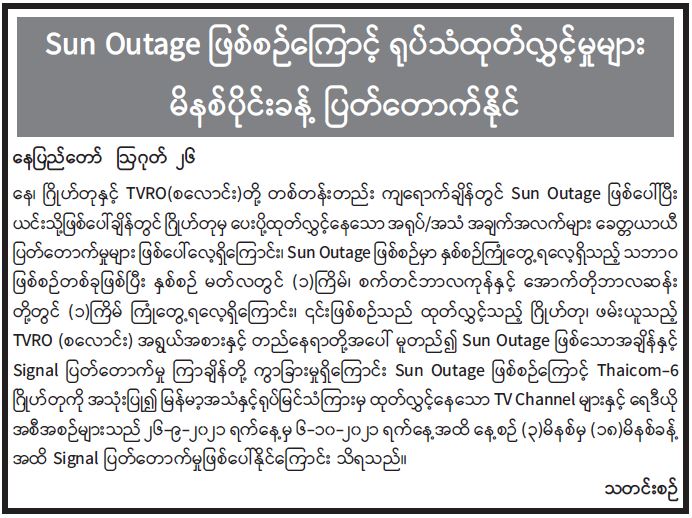 Sun Outage ဖြစ်စဉ်ကြောင့် ရုပ်သံထုတ်လွှင့်မှုများ မိနစ်ပိုင်းခန့် ပြတ်တောက်နိုင်