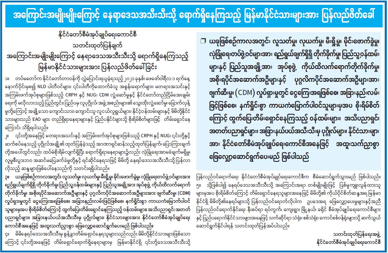 အကြောင်းအမျိုးမျိုးကြောင့် နေရာဒေသအသီးသီးသို့ ရောက်ရှိနေကြသည့် မြန်မာနိုင်ငံသားများအား ပြန်လည်ဖိတ်ခေါ် 08/27/2021