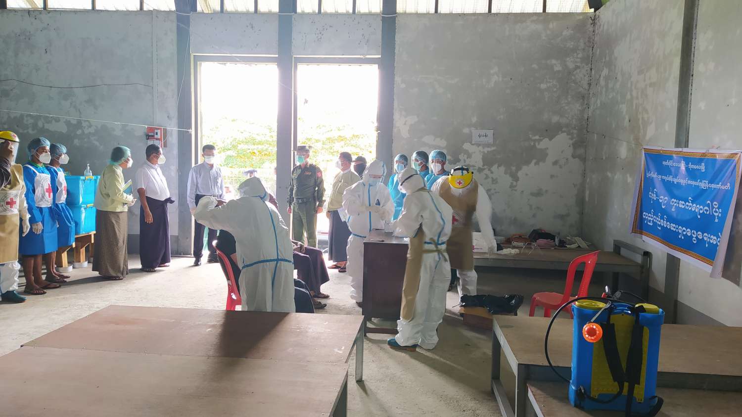 ဆက်လက်၍ မြို့နယ် ကိုဗစ်-၁၉ ကာကွယ်ထိန်းချုပ်ရေးနှင့်အရေးပေါ်တုံ့ပြန်ရေးကော်မတီ၊ ကိုဗစ်-၁၉ ကူးစက်ရောဂါပိုး လှည့်လည်စစ်ဆေးရှာဖွေရေးအဖွဲ့မှ မြို့နယ်ဘေးအန္တရာယ်ဆိုင်ရာ စီမံခန့်ခွဲမှု ဦးစီးဌာနရုံး၌ အမှတ်(၉)ရပ်ကွက်အတွင်းရှိ ပြည်သူများအား Test-Kit ဖြင့် ကိုဗစ်-၁၉ကူးစက်ရောဂါ ရှိ/မရှိ ရှာဖွေစစ်ဆေးနေမှုလုပ်ငန်း ဆောင်ရွက်လျက်ရှိရာ အဆိုပါ လုပ်ငန်း ဆောင်ရွက်နေမှုကိုလည်း ဧရာဝတီတိုင်းဒေသကြီးဝန်ကြီးချုပ်နှင့်အဖွဲ့မှ လှည့်လည်ကြည့်ရှု အားပေးခဲ့ကြောင်း သိရသည်။