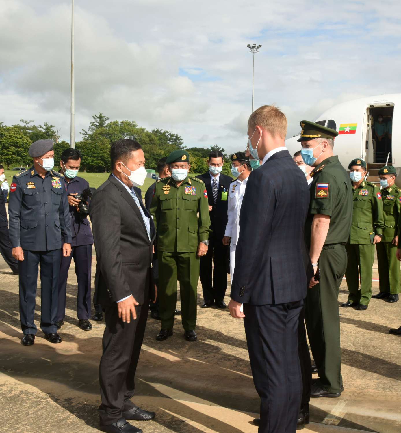 ထို့နောက် နိုင်ငံတော်စီမံအုပ်ချုပ်ရေးကောင်စီ ဒုတိယဥက္ကဋ္ဌ၊ ဒုတိယတပ်မတော် ကာကွယ်ရေးဦးစီးချုပ် ကာကွယ်ရေးဦးစီးချုပ် (ကြည်း) ဉီးဆောင်သည့် ကိုယ်စားလှယ်အဖွဲ့သည် မြန်မာစံတော်ချိန် ယနေ့နံနက် ၈ နာရီခန့်တွင် နေပြည်တော် တပ်မတော်လေဆိပ်သို့ ပြန်လည်ရောက်ရှိကြရာ နိုင်ငံတော်စီမံအုပ်ချုပ်ရေးကောင်စီဝင်၊ ကာကွယ်ရေးဉီးစီးချုပ်(လေ) ဗိုလ်ချုပ်ကြီး မောင်မောင်ကျော်၊ ညှိနှိုင်းကွပ်ကဲ ရေးမှူး(ကြည်း၊ ရေ၊ လေ) ဗိုလ်ချုပ်ကြီး မောင်မောင်အေးနှင့် ကာကွယ်ရေးဦးစီးချုပ်ရုံး (ကြည်း၊ ရေ၊ လေ) မှ တပ်မတော်အရာရှိကြီးများ၊ နေပြည်တော်တိုင်း စစ်ဌာနချုပ် တိုင်းမှူး၊ မြန်မာနိုင်ငံဆိုင်ရာ ရုရှားဖက်ဒရေးရှင်းနိုင်ငံသံရုံးမှ သံရုံး ဒုတိယအကြီးအကဲ Mr. Pavel Klabukov နှင့် တာဝန်ရှိသူများက လေဆိပ်၌ ကြိုဆို နှုတ်ဆက်ခဲ့ကြသည်။