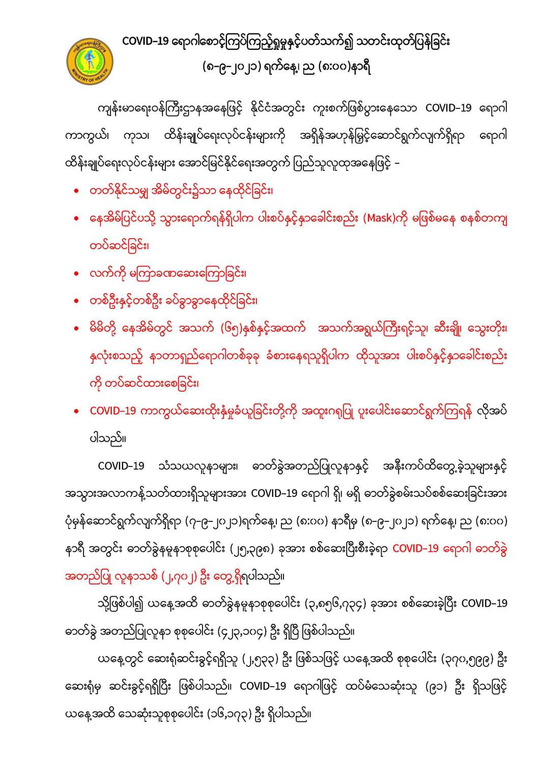 COVID-19 ရောဂါစောင့်ကြပ်ကြည့်ရှုမှုနှင့်ပတ်သက်၍သတင်းထုတ်ပြန်ခြင်း (၈-၉-၂၀၂၁) ရက်နေ့၊ ည (၈:၀၀)နာရီ 09/08/2021