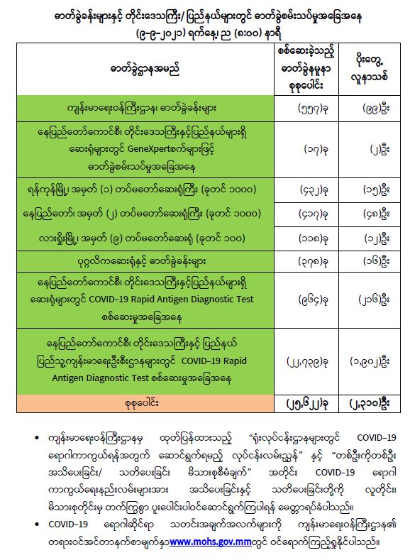 COVID-19 သံသယလူနာများ၊ ဓာတ်ခွဲအတည်ပြုလူနာနှင့် အနီးကပ်ထိတွေ့ခဲ့သူများနှင့် အသွားအလာကန့်သတ်ထားရှိသူများအား COVID-19 ရောဂါ ရှိ၊ မရှိ ဓာတ်ခွဲစမ်းသပ် စစ်ဆေး ခြင်းအား ပုံမှန်ဆောင်ရွက်လျက်ရှိရာ (၈-၉-၂၀၂၁)ရက်နေ့၊ ည (၈:၀၀)နာရီမှ (၉-၉-၂၀၂၁) ရက်နေ့၊ ည (၈:၀၀) နာရီအတွင်း ဓာတ်ခွဲနမူနာစုစုပေါင်း(၂၅,၆၂၂)ခုအား စစ်ဆေးပြီးစီးခဲ့ရာ COVID-19 ရောဂါ ဓာတ်ခွဲ အတည်ပြုလူနာသစ်(၂,၃၁၀)ဦးတွေ့ရှိရပါသည်။