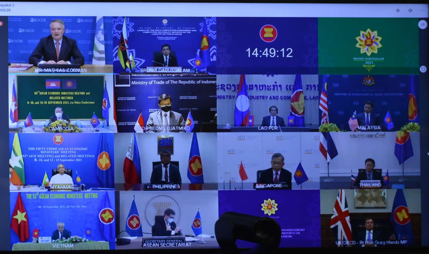 (၅၃) ကြိမ်မြောက် အာဆီယံစီးပွားရေးဝန်ကြီးများ အစည်းအဝေး ဒုတိယနေ့ကို ဗီဒီယို ကွန်ဖရင့်စနစ်ဖြင့် ဆက်လက်ကျင်းပခဲ့ရာ ရင်းနှီးမြှုပ်နှံမှုနှင့် နိုင်ငံခြားစီးပွားဆက်သွယ်ရေး ဝန်ကြီးဌာန၊ ပြည်ထောင်စုဝန်ကြီး ဦးအောင်နိုင်ဦးသည် နေပြည်တော်ရှိ ရင်းနှီးမြှုပ်နှံမှုနှင့် နိုင်ငံခြားစီးပွား ဆက်သွယ်ရေးဝန်ကြီးရုံးမှ ပါဝင်တက်ရောက်သည်။