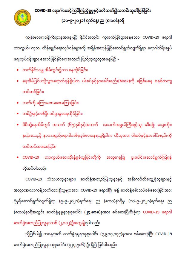 COVID-19 ရောဂါစောင့်ကြပ်ကြည့်ရှုမှုနှင့်ပတ်သက်၍သတင်းထုတ်ပြန်ခြင်း (၁၀-၉-၂၀၂၁) ရက်နေ့၊ ည (၈:၀၀)နာရီ
