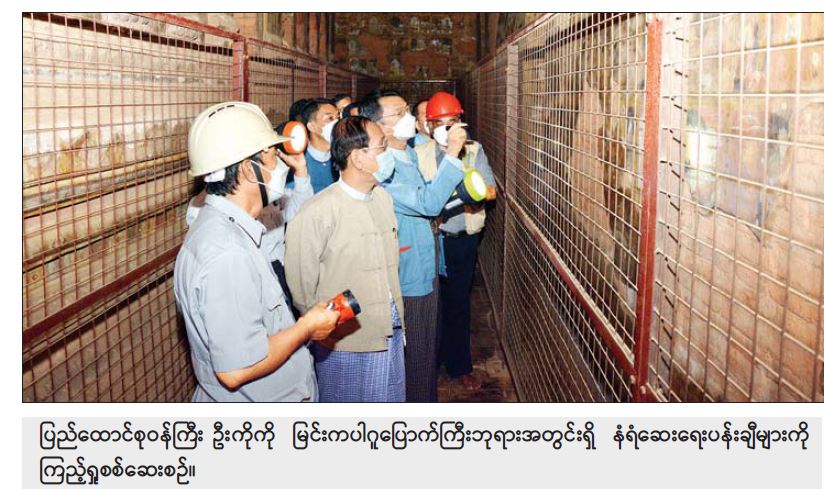 ထို့နောက် မြင်းကပါဂူပြောက်ကြီးဘုရား အတွင်းရှိ နံရံဆေးရေးပန်းချီများ၊ Korea Cultural Heritage Foundation (KCHF)က ပညာရှင်များနှင့် ဌာနမှဝန်ထမ်းများပူးပေါင်း၍ အဆောက်အအုံပိုင်းနှင့် နံရံပန်းချီများ ထိန်းသိမ်းဆောင်ရွက်ခဲ့သည့် ဘုရားသုံးဆူနှင့် သံပျင်စွာဘုရားတို့ကို ကြည့်ရှုစစ်ဆေးပြီး မူလပုံစံမပျက် ပြန်လည်ပြုပြင်ရန်၊  ဝန်ထမ်းများ အနေဖြင့် ပညာရပ်များကို နားလည်တတ်ကျွမ်းအောင် လေ့လာသင်ယူရန်၊ များပြားလှသော ရှေးဟောင်းအဆောက်အအုံများကို မိမိတို့ဌာနဝန်ထမ်းများဖြင့် ရေရှည်ထိန်းသိမ်းနိုင်ရေး စီမံဆောင်ရွက်ရန်၊ မိုးရွာသွန်းမှုများကြောင့် စေတီများ ထိခိုက်မှုများ မရှိစေရန် ဝန်ထမ်းများ အနေဖြင့် အဆက်မပြတ် ကွင်းဆင်းစစ်ဆေးပြီး ထိန်းသိမ်းမှုလုပ်ငန်းများကို အချိန်နှင့်တစ်ပြေးညီ ဆောင်ရွက်ကြရန် မှာကြားခဲ့ကြောင်း သိရသည်။