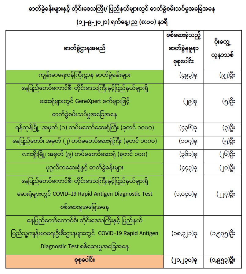 သို့ဖြစ်ပါ၍ ယနေ့အထိ ဓာတ်ခွဲနမူနာစုစုပေါင်း (၃,၉၅၄,၆၀၀)ခုအား စစ်ဆေးခဲ့ပြီး COVID-19 ဓာတ်ခွဲအတည်ပြုလူနာ စုစုပေါင်း (၄၃၁,၈၃၃) ဦး ရှိပြီ ဖြစ်ပါသည်။