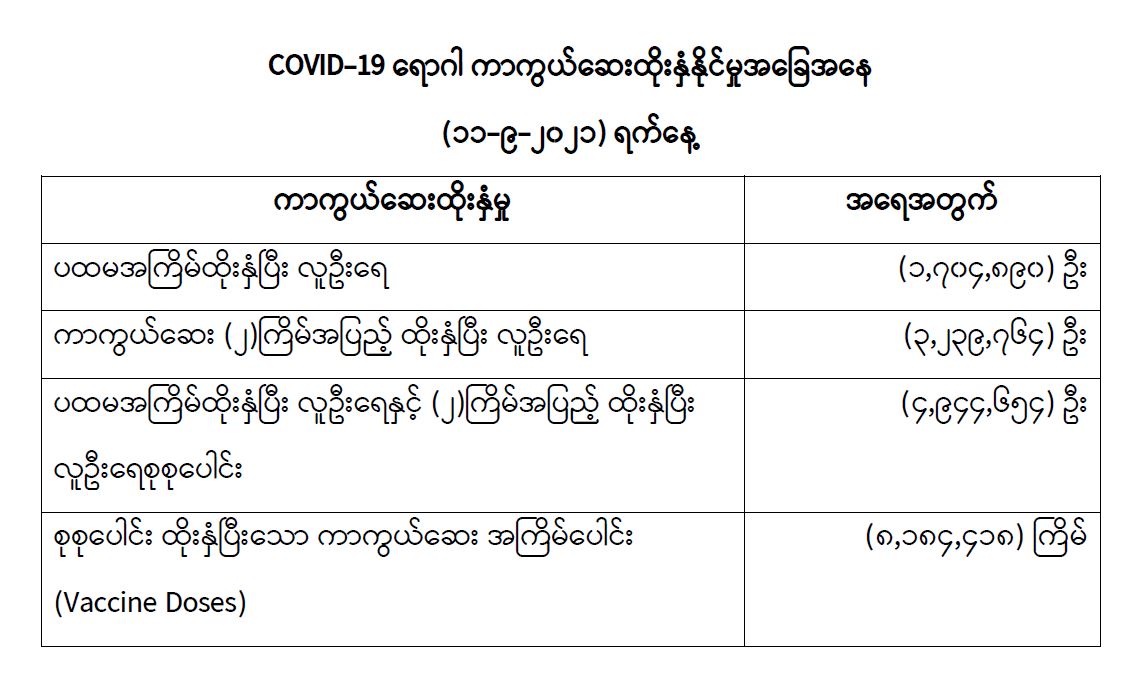 COVID-19 ရောဂါကာကွယ်ထိန်းချုပ်ရေးအတွက် တိုင်းဒေသကြီး/ပြည်နယ်များတွင် COVID-19 ရောဂါကာကွယ်ဆေးကို ဦးတည်အုပ်စုများသတ်မှတ်၍ ထိုးနှံပေးလျက်ရှိရာ (၁၁-၉-၂၀၂၁) ရက်နေ့အထိ လူဦးရေစုစုပေါင်း (၄,၉၄၄,၆၅၄) ဦးအား ထိုးနှံပေးပြီးဖြစ်၍  ကာကွယ်ဆေးနှစ် ကြိမ်အပြည့် ထိုးနှံပြီးစီးသူ (၃,၂၃၉,၇၆၄) ဦးနှင့်  ပထမအကြိမ်ထိုးနှံပြီးစီးသူ (၁,၇၀၄,၈၉၀) ဦးရှိပြီဖြစ်ပါသည်။