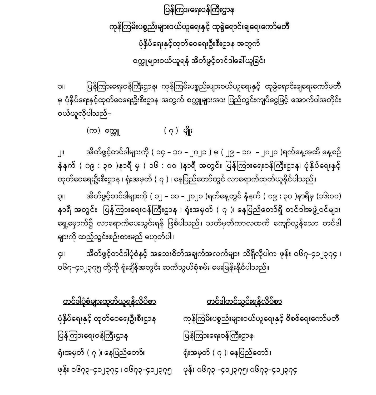ပြန်ကြားရေးဝန်ကြီးဌာန ကုန်ကြမ်းပစ္စည်းများဝယ်ယူရေးနှင့် ထုခွဲရောင်းချရေးကော်မတီ ပုံနှိပ်ရေးနှင့်ထုတ်ဝေရေးဦးစီးဌာနအတွက် စက္ကူများဝယ်ယူရန် အိတ်ဖွင့်တင်ဒါခေါ်ယူခြင်း