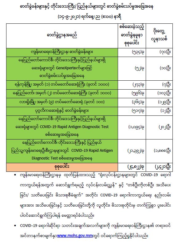 သို့ဖြစ်ပါ၍ ယနေ့အထိ ဓာတ်ခွဲနမူနာစုစုပေါင်း (၄,၀၀၂,၈၄၆)ခုအား စစ်ဆေးခဲ့ပြီး COVID-19 ဓာတ်ခွဲအတည်ပြုလူနာစုစုပေါင်း (၄၃၆,၅၂၇) ဦး ရှိပြီ ဖြစ်ပါသည်။