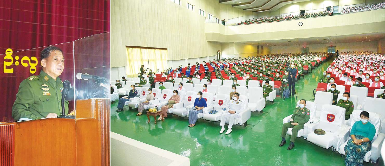 တပ်မတော်၏ အဓိကတာဝန်သည် နိုင်ငံတော်ကာကွယ်ရေးတာဝန်ဖြစ်ပြီး လိုအပ်ချက်အရ နိုင်ငံတော်၏ တာဝန်များကို ခေတ္တတာဝန်ယူ ထမ်းဆောင်နေရခြင်းဖြစ်ကြောင်း၊ စစ်စည်းကမ်း သည် တပ်မတော်၏ ကျောရိုးပင်ဖြစ်သဖြင့် စည်းကမ်းသေဝပ်၍ အမိန့်နာခံမှုကောင်းစွာဖြင့် လုပ်ဆောင်ကြစေလိုကြောင်းနှင့် မိမိတို့တာဝန် ထမ်းဆောင်သည့် တပ်၊ တပ်မတော်၊ ဒေသနှင့် တိုင်းပြည်၏ အကျိုးစီးပွားကို ကောင်းမွန်တိုးတက်အောင် မိမိတို့ တတ်စွမ်းသရွေ့ ကြိုးပမ်း ဆောင်ရွက်ရမည်ဖြစ်ပြီး မိမိကိုယ်ကို ထိန်းသိမ်း နေထိုင်ကြရမည်ဖြစ်ကြောင်း နိုင်ငံတော် စီမံအုပ်ချုပ်ရေးကောင်စီဥက္ကဋ္ဌ တပ်မတော်ကာကွယ်ရေးဦးစီးချုပ် ဗိုလ်ချုပ်မှူးကြီး မင်းအောင်လှိုင် က ယနေ့မွန်းလွဲပိုင်းတွင် ပြင်ဦးလွင်တပ်နယ်ရှိ နည်းပြအရာရှိကြီးများ၊ ကထိက အရာရှိကြီးများ၊ ပါရဂူဆေးမှူးများ၊ ဆရာ၊ ဆရာမများ၊ သန္ဓေအရာရှိ၊ စစ်သည်၊ မိသားစု များအား စစ်တက္ကသိုလ်၊ ဘွဲ့နှင်းသဘင်ခန်းမ၌ တွေ့ဆုံအမှာစကားပြောကြားစဉ် ထည့်သွင်း ပြောကြားသည်။
