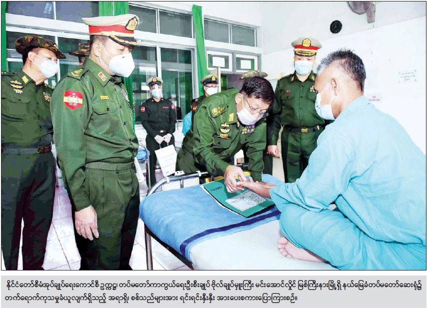 ဆက်လက်ပြီး နိုင်ငံတော်စီမံအုပ်ချုပ်ရေးကောင်စီဥက္ကဋ္ဌ တပ်မတော်ကာကွယ်ရေး ဦးစီးချုပ်၊ ဇနီးနှင့် အဖွဲ့ဝင်များသည် မြစ်ကြီးနားမြို့ရှိ နယ်မြေခံတပ်မတော်ဆေးရုံသို့ သွားရောက်ကြည့်ရှုစစ်ဆေးပြီး ဆေးရုံတက်ရောက်ကုသမှုခံယူလျက်ရှိသည့် အရာရှိ၊ စစ်သည်၊ အား ရင်းရင်းနှီးနှီး အားပေးစကား ပြောကြားကာ စားသောက်ဖွယ်ရာများ ပေးအပ်ခဲ့ ကြောင်း သတင်းရရှိသည်။