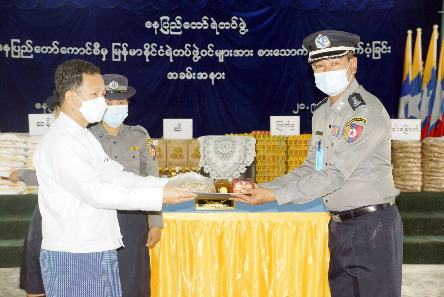 နေပြည်တော် ကောင်စီမှ ကိုဗစ်-၁၉ရောဂါ တားဆီးကာကွယ်ရေးလုပ်ငန်းများကို စွမ်းစွမ်း တမံပါဝင် ဆောင်ရွက် ခဲ့ကြသည့် မြန်မာနိုင်ငံရဲတပ်ဖွဲ့ဝင်များကို စားသောက်ကုန်များ ထောက်ပံ့ခြင်း အခမ်းအနားကို ယနေ့နံနက်(၉)နာရီတွင် နေပြည်တော်ရဲတပ်ဖွဲ့မှူးရုံး အစည်းအဝေးခန်းမ၌ ကျင်းပသည်။