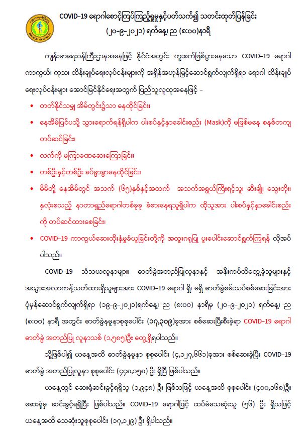 COVID-19 ရောဂါ စောင့်ကြပ်ကြည့်ရှုမှုနှင့် ပတ်သက်၍ သတင်းထုတ်ပြန်ခြင်း (၂၀-၉-၂၀၂၁) ရက်နေ့၊ ည (၈:၀၀)နာရီ 09/20/2021