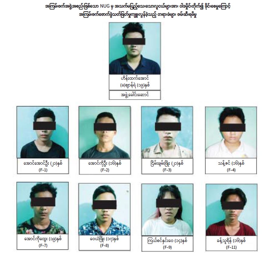 NUG အကြမ်းဖက်အဖွဲ့အစည်းက အသက်မပြည့်သေးသော လူငယ်များကို ဝါဒမှိုင်းတိုက်၍ ခိုင်းစေမှုကြောင့် ဖောက်ခွဲ ဖျက်ဆီးမှု တစ်ကြိမ်၊ အကြမ်းဖက်သတ်ဖြတ်မှု သုံးကြိမ် ကျူးလွန်ခဲ့သူ တရားခံ ကိုးဦး ဖမ်းဆီးရမိ