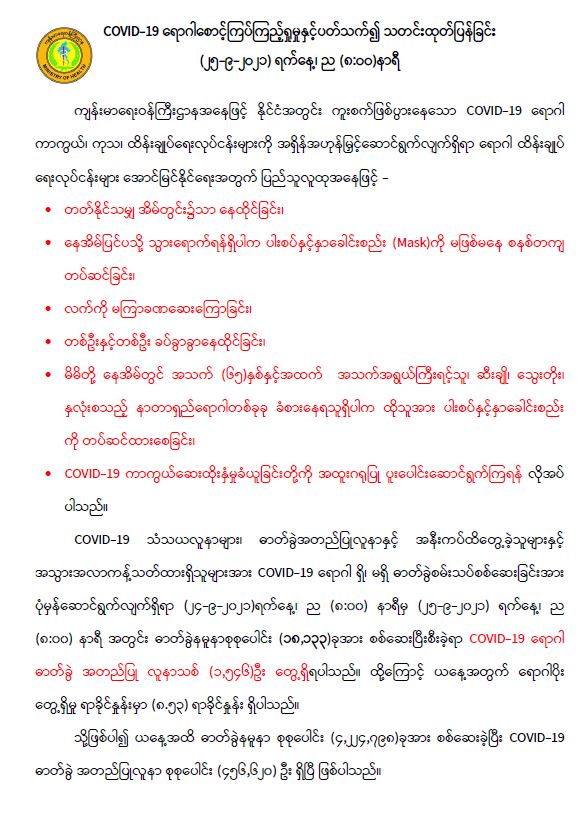 COVID-19 ရောဂါ စောင့်ကြပ်ကြည့်ရှုမှုနှင့် ပတ်သက်၍သတင်းထုတ်ပြန်ခြင်း (၂၅-၉-၂၀၂၁) ရက်နေ့၊ ည (၈:၀၀)နာရီ
