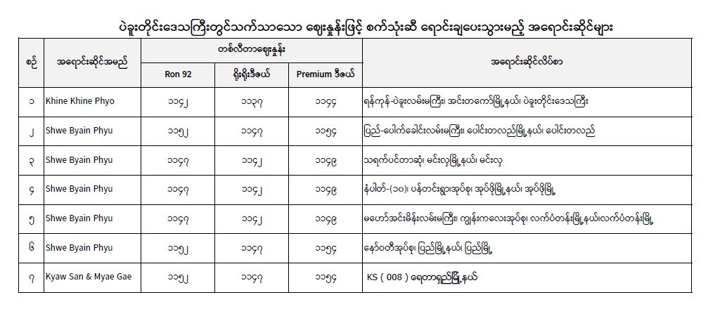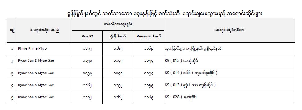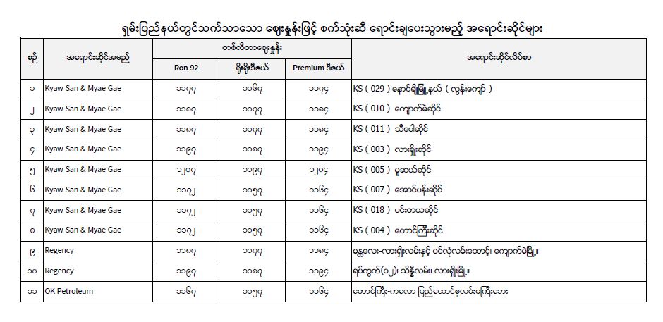 ထပ်မံ၍ ကျန်တိုင်းဒေသကြီး/ပြည်နယ်များတွင် သတ်မှတ်ဈေးနှုန်းဖြင့် ရောင်းချပေးနေသည့် စက်သုံးဆီဈေးနှုန်းနှင့် အရောင်းဆိုင်လိပ်စာတို့ကို ပြည်သူများ သိရှိဝယ်ယူနိုင်ရန် ထပ်မံဖော်ပြထားသည်။