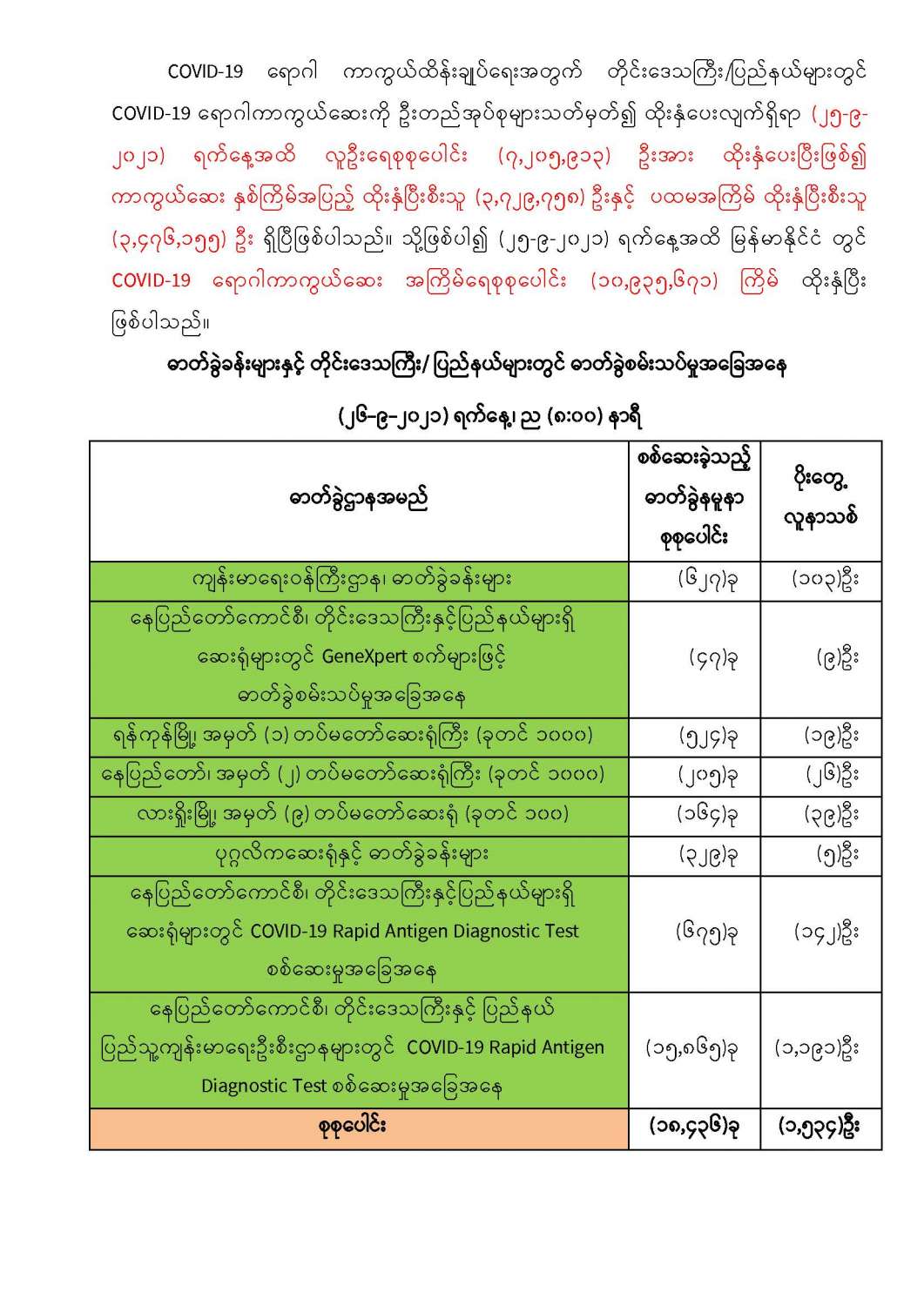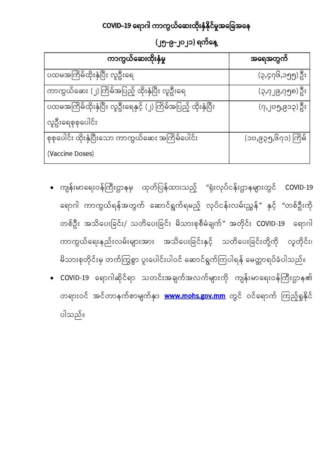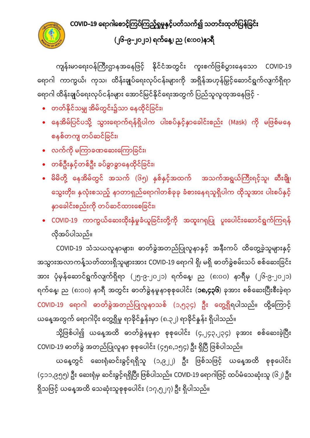 COVID-19 ရောဂါစောင့်ကြပ်ကြည့်ရှုမှုနှင့်ပတ်သက်၍သတင်းထုတ်ပြန်ခြင်း (၂၆-၉-၂၀၂၁) ရက်နေ့၊ ည (၈:၀၀)နာရီ
