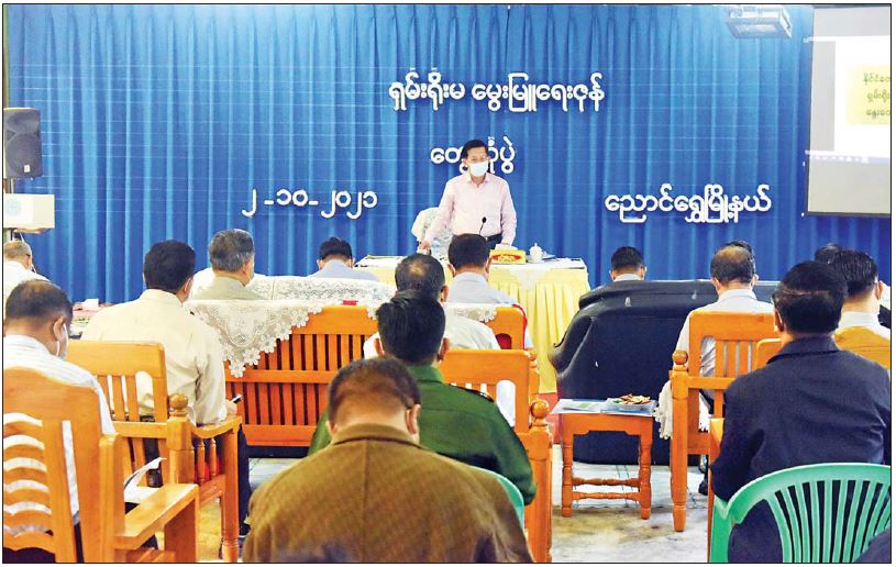 ဦးစွာ ရှမ်းရိုးမမွေးမြူရေးဇုန် ရှင်းလင်းဆောင်၌ မွေးမြူရေးနှင့် ကုသရေးဦးစီးဌာန ပြည်နယ်ဦးစီးမှူး ဒေါက်တာဝင်းဇင်မောင်က ရှမ်းရိုးမမွေးမြူရေးဇုန်အတွင်း မွေးမြူရေးလုပ်ငန်းများ ဆောင်ရွက်နေမှုများ၊ မွေးမြူထုတ်လုပ်နိုင်မှု အခြေအနေနှင့် ဖြည့်ဆည်းပေးရန် လိုအပ်ချက်များအားလည်းကောင်း၊ စက်မှုကြီးကြပ်ရေးဦးစီးဌာနနှင့် စစ်ဆေးရေးဦးစီးဌာန ပြည်နယ်ညွန်ကြားရေးမှုး ဦးစိုးမင်းသူက အေးသာယာ စက်မှုဇုန်၌ စက်မှုလုပ်ငန်း ဆောင်ရွက်နေမှုများအားလည်းကောင်း၊  ညောင်ရွှေမြို့နယ် ဆည်မြောင်းနှင့်ရေအသုံးချမှု စီမံခန့်ခွဲရေးဦးစီးဌာန လက်ထောက်ညွှန်ကြားရေးမှူး ဦးကျော်ကျော်ဦးက အင်းလေးကန် ရေရှည်တည်တံ့ခိုင်မြဲရေးအတွက် ဆောင်ရွက်နေမှုနှင့် အနာဂတ်တွင် ဆက်လက် ဆောင်ရွက်သွားမည့် လုပ်ငန်းများအား လည်းကောင်း ရှင်းလင်းတင်ပြကြသည်။