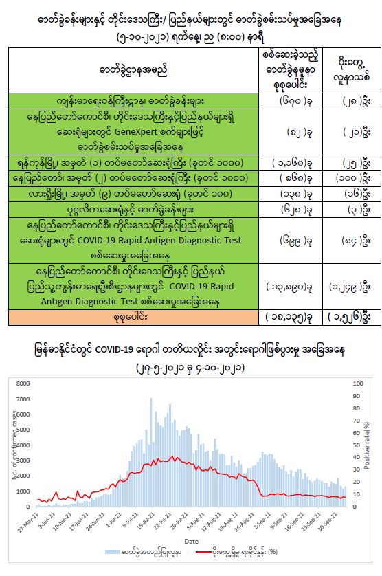 COVID-19 သံသယလူနာများ၊ ဓာတ်ခွဲအတည်ပြုလူနာနှင့် အနီးကပ်ထိတွေ့ခဲ့သူများနှင့် အသွားအလာ ကန့်သတ်ထားရှိသူများ အား COVID-19 ရောဂါ ရှိ၊ မရှိ ဓာတ်ခွဲစမ်းသပ် စစ်ဆေးခြင်းအား ပုံမှန်ဆောင်ရွက်လျက်ရှိရာ (၄-၁၀-၂၀၂၁) ရက်နေ့၊ ည (:၀၀) နာရီမှ (၅-၁၀-၂၀၂၁) ရက်နေ့၊ ည (:၀၀) နာရီအတွင်း ဓာတ်ခွဲနမူနာစုစုပေါင်း (၁၈,၁၃၅) ခုအား စစ်ဆေးပြီးစီးခဲ့ရာ COVID-19 ရောဂါဓာတ်ခွဲအတည်ပြုလူနာသစ် (၁,၅၂၆) ဦး တွေ့ရှိရပါသည်။ ထို့ကြောင့် ယနေ့အတွက် ရောဂါပိုး တွေ့ရှိမှုရာခိုင်နှုန်းမှာ (၈.၄) ရာခိုင်နှုန်းရှိပါသည်။