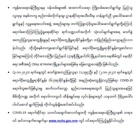 ကျန်းမာရေးဝန်ကြီးဌာနအနေဖြင့် နိုင်ငံအတွင်း ကူးစက်ဖြစ်ပွားနေသော COVID-19 ရောဂါ ကာကွယ်၊ ကုသ၊ ထိန်းချုပ်ရေး လုပ်ငန်းများကို အရှိန်အဟုန်မြှင့်ဆောင်ရွက်လျက်ရှိရာ ရောဂါ ထိန်းချုပ်ရေးလုပ်ငန်းများ အောင်မြင်နိုင်ရေးအတွက် ပြည်သူလူထု အနေဖြင့် ကျန်းမာရေး ဝန်ကြီးဌာနမှ ထုတ်ပြန်ထားသော COVID-19 ရောဂါ ကာကွယ်ထိန်းချုပ်ရေးဆိုင်ရာ စည်းကမ်းများကို စနစ်တကျ လိုက်နာဆောင်ရွက်ရန်လိုအပ်ပြီး COVID-19 ကာကွယ်ဆေး ထိုးနှံမှုခံယူခြင်းအား အထူးဂရုပြု ပူးပေါင်း ဆောင်ရွက်ကြရန် လိုအပ်ပါသည်။