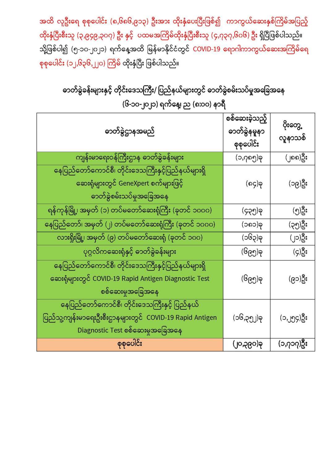 သို့ဖြစ်ပါ၍ ယနေ့အထိ ဓာတ်ခွဲနမူနာစုစုပေါင်း (၄,၄၃၁,၇၀၅)ခုအား စစ်ဆေးခဲ့ပြီး COVID-19 ဓာတ်ခွဲအတည်ပြုလူနာ စုစုပေါင်း (၄၇၃,၀၂၅) ဦး ရှိပြီ ဖြစ်ပါသည်။