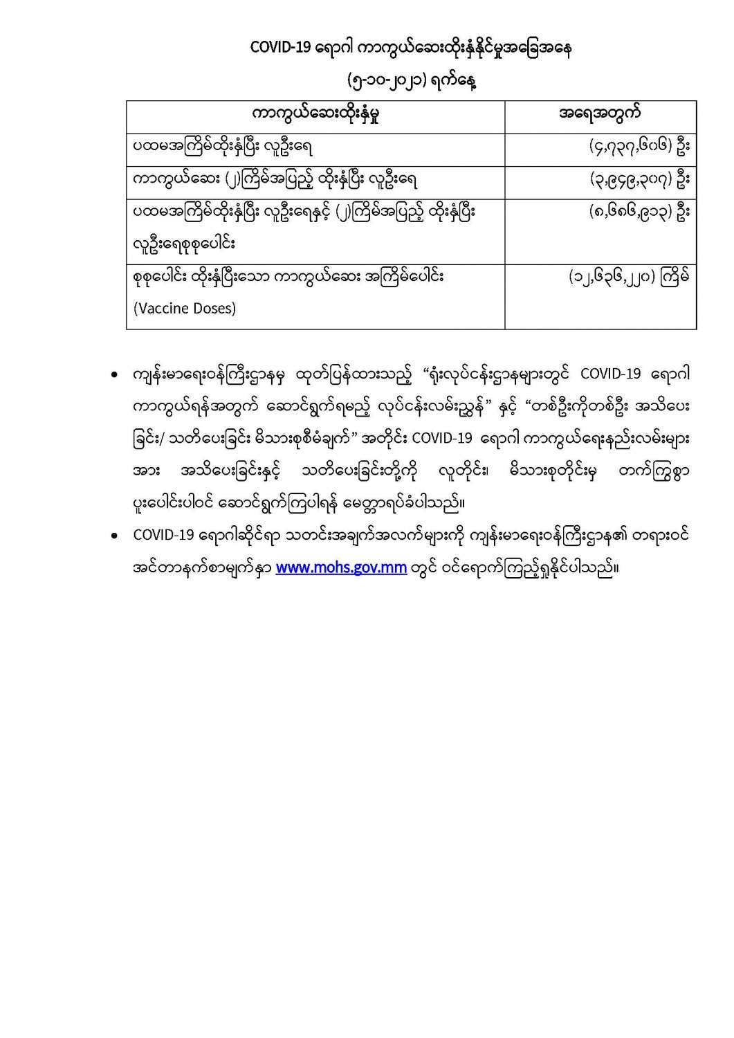 COVID-19 ရောဂါ ကာကွယ်ထိန်းချုပ်ရေးအတွက် တိုင်းဒေသကြီး/ပြည်နယ်များတွင် COVID-19 ရောဂါကာကွယ်ဆေးကို ဦးတည်အုပ်စုများသတ်မှတ်၍ ထိုးနှံပေးလျက်ရှိရာ (၅-၁၀-၂၀၂၁) ရက်နေ့ အထိ လူဦးရေစုစုပေါင်း (၈,၆၈၆,၉၁၃) ဦးအား ထိုးနှံပေးပြီးဖြစ်၍  ကာကွယ်ဆေး နှစ်ကြိမ်အပြည့် ထိုးနှံပြီးစီးသူ (၃,၉၄၉,၃၀၇) ဦး နှင့်  ပထမအကြိမ်ထိုးနှံပြီးစီးသူ (၄,၇၃၇,၆၀၆) ဦးရှိပြီဖြစ်ပါသည်။