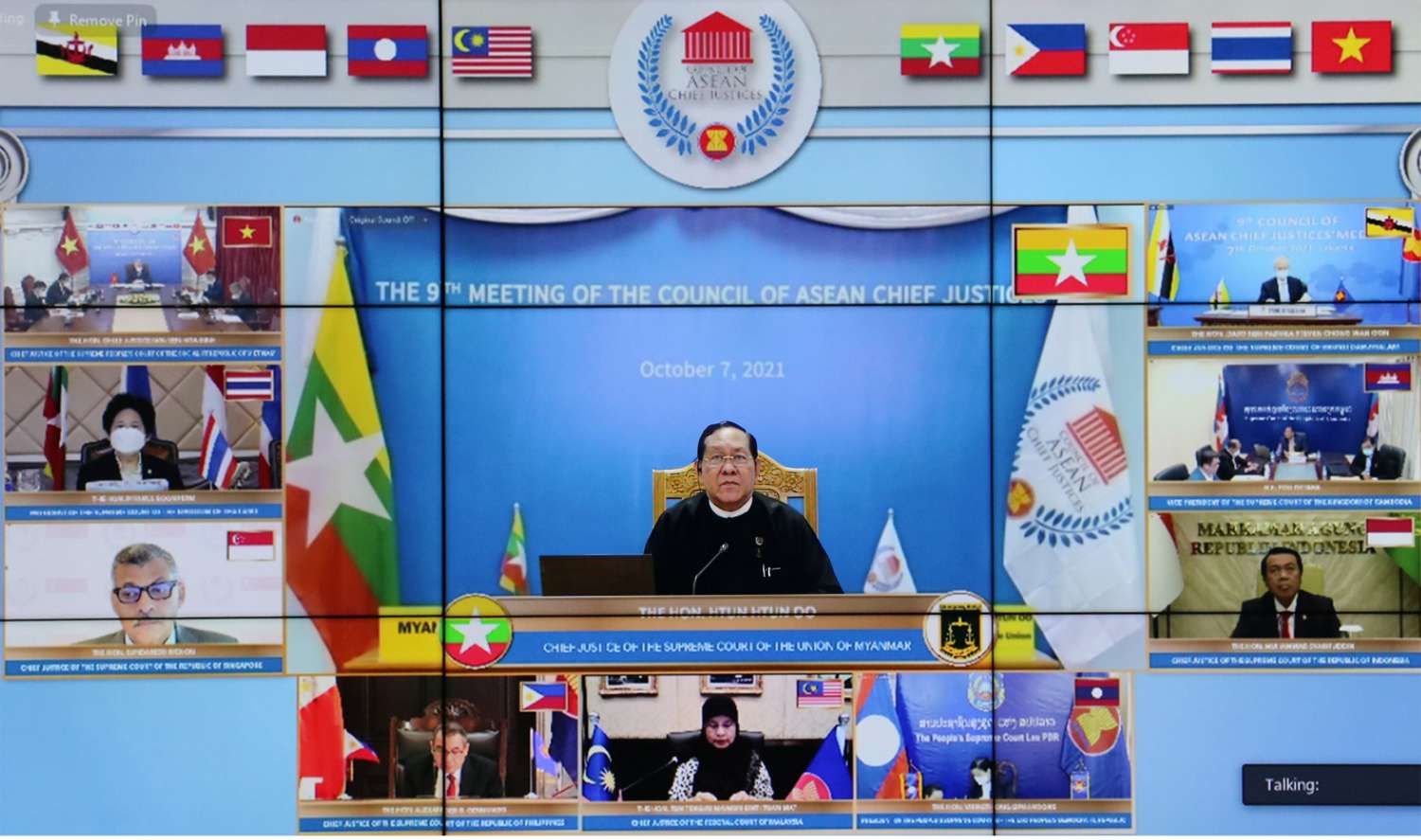အင်ဒိုနီးရှားသမ္မတနိုင်ငံ၊ တရားရုံးချုပ်မှကြီးမှူး၍ “(၉) ကြိမ်မြောက် အာဆီယံတရားသူကြီးချုပ် များကောင်စီ အစည်းအဝေး (The 9th Meeting of the Council of ASEAN Chief Justices)” ကို ယနေ့ နံနက် ၈ နာရီတွင် ဗီဒီယိုကွန်ဖရင့်စနစ်ဖြင့် ကျင်းပရာ ပြည်ထောင်စုတရားသူကြီးချုပ် ဦးထွန်းထွန်းဦးသည် နေပြည်တော်ရှိ ပြည်ထောင်စုတရား လွှတ်တော်ချုပ်ရုံးမှ ပါဝင်တက် ရောက်သည်။
