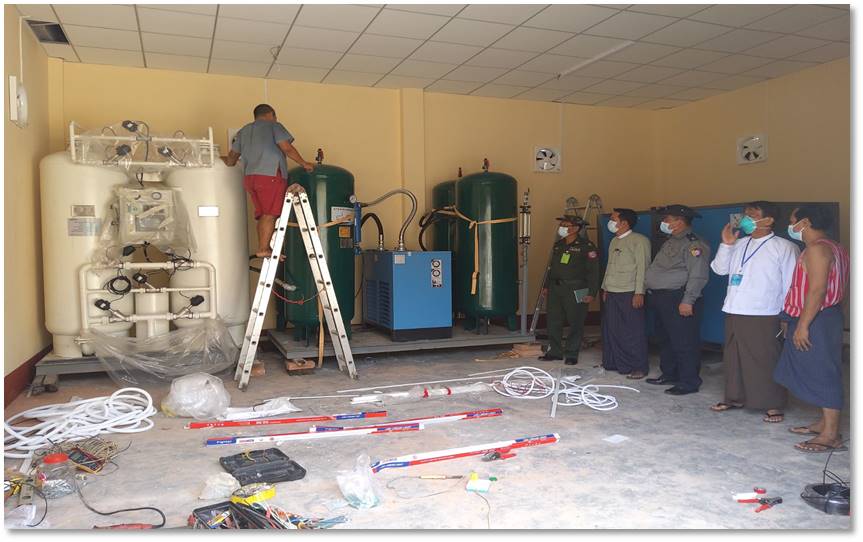 ထိုသို့ တပ်ဆင်ထုတ်လုပ်ပေးလျက်ရှိရာ ယနေ့တွင် ဧရာဝတီတိုင်းဒေသကြီး၊ ပုသိမ်မြို့ အထွေထွေရောဂါကုဆေးရုံကြီး (ခုတင်-၅၀၀)သို့ ပုသိမ်စက်မှုဇုန်ရှိ Ayeyar wady Development Public Group မှ လှူဒါန်းသော အောက်ဆီဂျင်ထုတ် လုပ်သည့်စက် ရောက်ရှိ တပ်ဆင်နေမှု အခြေအနေများအားလည်းကောင်း၊ မကွေး တိုင်းဒေသကြီး၊ မကွေးမြို့၊ နယ်မြေခံ တပ်မတော်ဆေးရုံ၌ စတင်လည်ပတ်နေသည့် Oxygen Plant စက်ရုံအားလည်းကောင်း သက်ဆိုင်ရာတိုင်းဒေသကြီး ဝန်ကြီးချုပ်၊ တိုင်းမှူးနှင့် တာဝန်ရှိသူများက သွားရောက်ကြည့်ရှုပြီး လိုအပ်သည်များ ညှိနှိုင်း ဆောင်ရွက်ပေးခဲ့ကြကြောင်း သတင်းရရှိသည်။