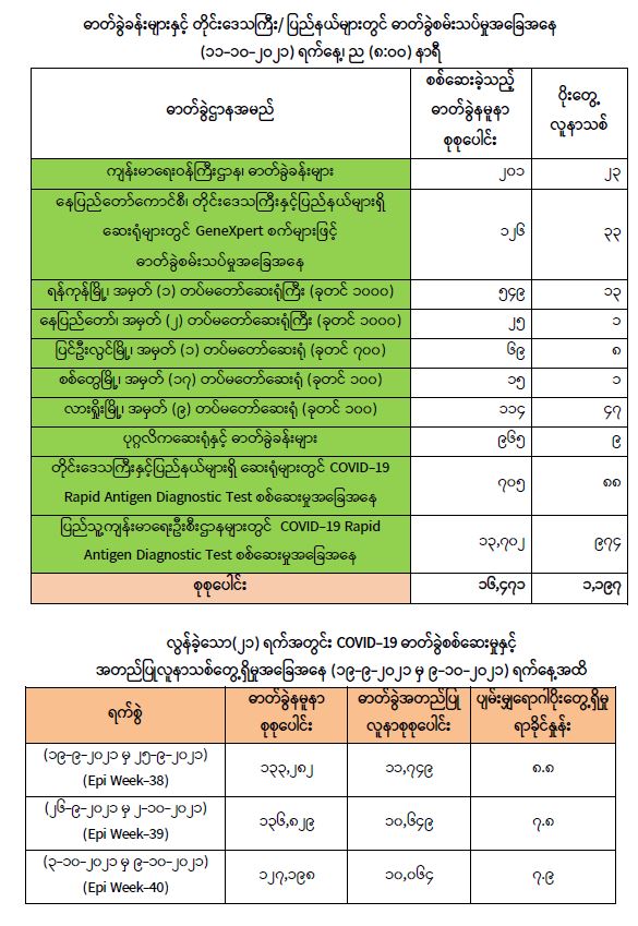 COVID-19 သံသယလူနာများ၊ ဓာတ်ခွဲအတည်ပြုလူနာနှင့် အနီးကပ်ထိတွေ့ခဲ့သူများနှင့် အသွားအလာ ကန့်သတ်ထားရှိသူများ အား COVID-19 ရောဂါ ရှိ၊ မရှိ ဓာတ်ခွဲစမ်းသပ် စစ်ဆေးခြင်းအား ပုံမှန်ဆောင်ရွက်လျက်ရှိရာ (၁၀-၁၀-၂၀၂၁) ရက်နေ့၊ ည (၈:၀၀) နာရီမှ (၁၁-၁၀-၂၀၂၁) ရက်နေ့၊ ည (၈:၀၀) နာရီအတွင်း ဓာတ်ခွဲနမူနာစုစုပေါင်း (၁၆,၄၇၁) ခုအား စစ်ဆေး ပြီးစီးခဲ့ရာ COVID-19 ရောဂါ ဓာတ်ခွဲအတည်ပြုလူနာသစ် (၁,၁၉၇) ဦးတွေ့ရှိရပါသည်။