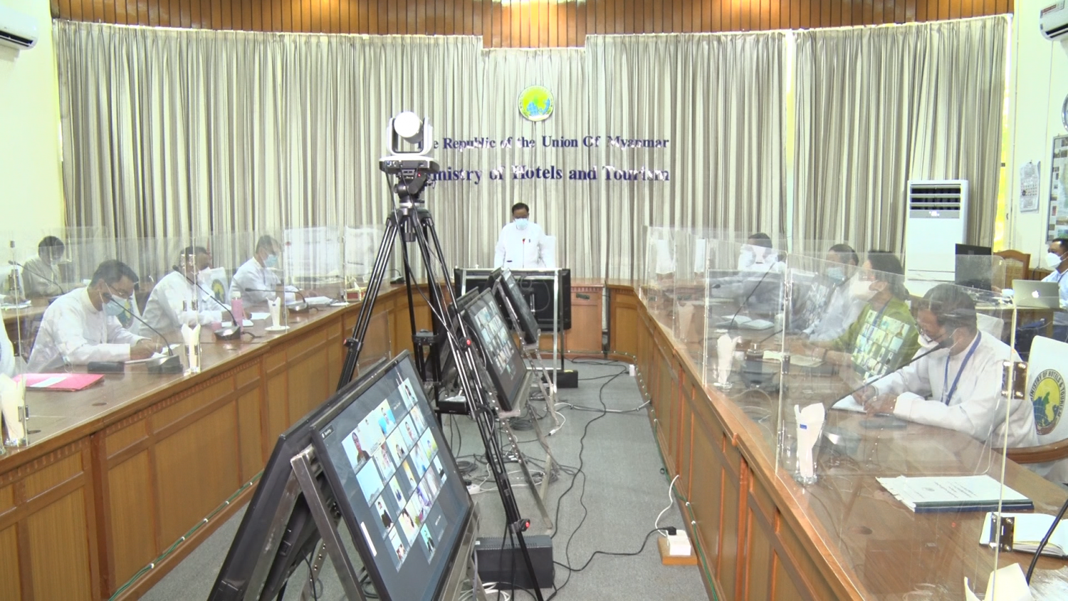 ပြည်ထောင်စုဝန်ကြီးသည် ယနေ့နံနက်ပိုင်းတွင် အင်းလေးကန် ရေရှည်ဖွံ့ဖြိုးတိုးတက်ရေး အတွက် အင်းလေးကန်နှင့်ဆက်စပ်နေသော ဟိုတယ်များ သန့်ရှင်းသာယာလှပရေး လုပ်ငန်းများ ဆောင်ရွက်နိုင်ရန် ညှိနှိုင်းအစည်းအဝေးကို ဝန်ကြီးဌာန နီလာအစည်းအဝေးခန်းမ၌ ဗီဒီယိုကွန်ဖရင့် စနစ်ဖြင့် ကျင်းပရာ ညွှန်ကြားရေးမှူးချုပ်များ၊ ဒုတိယညွှန်ကြားရေး မှူးချုပ်များနှင့် ဌာနတာဝန် ရှိသူများ တက်ရောက်ကြပြီး၊ ဟိုတယ်နှင့်ခရီးသွား ညွှန်ကြားမှုဦးစီးဌာန၊ ရှမ်းပြည်နယ် ညွှန်ကြားရေး မှူးနှင့် အင်းလေးကန်နှင့်ဆက်စပ်နေသော ဟိုတယ် လုပ်ငန်းရှင်များမှ Online က တစ်ဆင့် ပါဝင် တက်ရောက်ကြသည်။