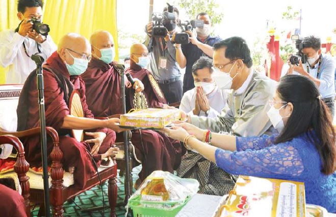 ထိုနောက် ဆရာတော်များထံမှ ငါးပါးသီလခံယူခြင်း၊ သံဃာတော်များက ပရိတ် တရားတော်များ ရွတ်ဖတ်ပူဇော်ခြင်းများ ပြုလုပ်ကြပြီး ပြည်ထောင်စုဝန်ကြီး ဦးမောင်မောင် အုန်းနှင့် ဇနီး ဒေါ်ခင်ဆွေဝင်းနှင့် တာဝန်ရှိသူများက ဆရာတော်၊ သံဃာတော်များထံ လှူဖွယ်ပစ္စည်းများ ဆက်ကပ်လှူဒါန်းကာ ရေစက်သွန်းချ အမျှပေးဝေကြသည်။