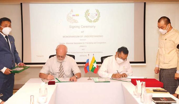 ရုရှား - မြန်မာချစ်ကြည်ရေးနှင့်ပူးပေါင်းဆောင်ရွက်ရေးအသင်း (RMFAC) နှင့် မြန်မာ -ရုရှားစီးပွားရေး ဖွံ့ဖြိုးမှု အသင်း(MRBDA)တို့၏ နှစ်နိုင်ငံ စီးပွားရေးနှင့် ကုန်သွယ်မှုများ ပူးပေါင်း ဆောင်ရွက်ခြင်း ဆိုင်ရာ နားလည်မှု စာချွန်လွှာရေးထိုးခြင်းအခမ်းအနားကို ယနေ့ မွန်းလွဲပိုင်းက ရန်ကုန်မြို့၌ ကျင်းပရာ ရုရှား - မြန်မာချစ်ကြည်ရေးနှင့် ပူးပေါင်းဆောင်ရွက်ရေးအသင်း၏ ဒုတိယဥက္ကဋ္ဌ အန်နာသိုလီ ဘူလော့ချ နိကော့ နှင့် ရုရှားနိုင်ငံမှ စီးပွားရေးဆိုင်ရာ တာဝန်ရှိကိုယ်စားလှယ်များ၊ မြန်မာ - ရုရှား စီးပွားရေး ဖွံ့ဖြိုးမှုအသင်း ဥက္ကဋ္ဌ ဦးသန်းဇော်နှင့် အလုပ်အမှု ဆောင် အဖွဲ့ဝင်များ တက်ရောက်သည်။