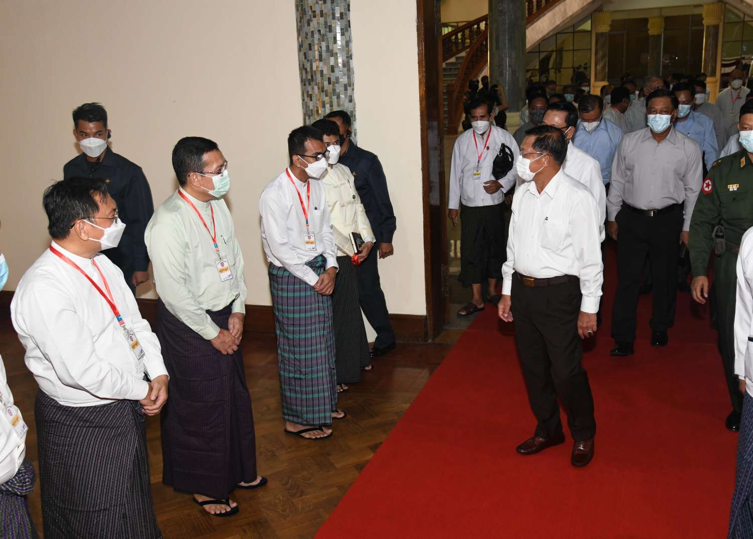 ကိုဗစ်-၁၉ ရောဂါဖြစ်ပွားချိန်တွင် မိမိတို့နိုင်ငံ၏ အဓိကအခက်အခဲမှာ ပစ္စည်းများ စုံလင်မှုမရှိခြင်းနှင့် ဆေးဝါးပစ္စည်းများ စုံလင်မှုမရှိခြင်း၊ လူသားအရင်းအမြစ် နည်းပါးခြင်းတို့ကြောင့် အကြပ်အတည်းများ ဖြစ်ပေါ်ခဲ့ကြောင်း၊ မိမိတို့နိုင်ငံသည့် လှူတန်းလိုစိတ်ရှိသူများ ပေါများခြင်းတို့ကြောင့် အခက်အခဲ ဖြစ်ပေါ်ချိန်တွင် အားလုံး ဝိုင်းဝန်းဆောင်ရွက်ခဲ့ကြသကဲ့သို့ မိတ်ဆွေနိုင်ငံများမှလည်း ကူညီခဲ့ကြမှုများရှိခဲ့ ကြောင်း၊ ယခုအခါ ကိုဗစ်-၁၉ ရောဂါဖြစ်ပွားမှုများ ကျဆင်းသွားပြီဖြစ်ကြောင်း၊ ကျန်ရှိသည့် ရောဂါ ဖြစ်ပွားမှုနှုန်းမြင့်တက်လျက်ရှိသည့် ဒေသများတွင်လည်း ကူးစက်မှုနှုန်းကျဆင်းရေး အလေးထား ဆောင်ရွက်လျက်ရှိကြောင်း၊ ကိုဗစ်ကြောင့် တုံ့ဆိုင်းခဲ့ရသည့် နိုင်ငံ့ယန္တရားများ ပြန်လည် လည်ပတ်နိုင်ရေး အတွက်လည်း အနုပညာရှင်များ အနေဖြင့် ဝိုင်းဝန်းကူညီပါဝင် ဆောင်ရွက်ကြစေလိုကြောင်း၊ မိမိတို့အနေဖြင့် တပ်မတော်မှ ပေးအပ်ထားသည့် ကတိအတိုင်း ရှေ့လုပ်ငန်းစဉ်များနှင့် ဦးတည်ချက် များချမှတ်၍ ဆောင်ရွက်လျက်ရှိကြောင်း၊ ရှေ့လုပ်ငန်းစဉ်များအား အကောင်အထည်ဖော် ဆောင်ရွက်ပြီးချိန်တွင် မိမိတို့နိုင်ငံ၏ လမ်းကြောင်းအား ပြန်လည်တည့်မတ်အောင် ဆောင်ရွက်ပေးမည် ဖြစ်ကြောင်း၊ ပါတီစုံဒီမိုကရေစီလမ်းကြောင်းသည် ပြည်သူများက ရွေးချယ် ဆောင်ရွက်ထားသည့် နိုင်ငံရေးလမ်းကြောင်းဖြစ်သဖြင့် စည်းကမ်းရှိသည့် ဒီမိုကရေစီလမ်းကြောင်းပေါ်တွင် လျှောက်လှမ်းနိုင်ရေး ဆောင်ရွက်သွားမည် ဖြစ်ကြောင်း၊ တိုင်းပြည်တည်ဆောက်ရေး လုပ်ငန်းများဖြစ်သည့် State Building၊ Nation Building များ တည်ဆောက်ရာတွင် အနုပညာရှင်များ၏ အခန်းကဏ္ဍမှာ အရေးကြီးကြောင်း၊ စာပေမှ တိုက်တွန်းချက်များ လုပ်ဆောင်ချက်များ များစွာ ဆောင်ရွက်၍ရကြောင်း၊ စာဖတ်ခြင်းမှသိရှိရသည့် အသိပညာများမှ ဖြန့်ဝေခံစား ဆောင်ရွက်ခြင်းဖြစ်ကြောင်း၊ အလားတူ ဂီတကဏ္ဍသည်လည်း လူတစ်ဦး ကလေးငယ် မှစ၍ သားချော့တေးမှစတင်ပြီး ကလေးငယ်၏စိတ်ကို ဂီတဖြင့် ပြုပြင်သွားခြင်း ပင်ဖြစ်ကြောင်း၊ ဂီတသည်လူများ၏ Mind Set ကိုပြုပြင်ပေးနိုင်သကဲ့သို့ နိုင်ငံကို ဖျက်ဆီးနိုင်မှုများလည်း ရှိကြောင်း၊ ရုပ်ရှင်ကဏ္ဍသည်လည်း လူများ၏စိတ်ကို ပြောင်းလဲနိုင်ကြောင်း၊ သဘင်ကဏ္ဍသည် ယဉ်ကျေးမှုနှင့်ပတ်သက်၍ ထိန်းသိမ်းပေးသည့် ပညာရပ်ဖြစ်သဖြင့် အရေးကြီးကြောင်း၊ ထို့ကြောင့် အနုပညာအဖွဲ့အစည်း များသည် နိုင်ငံအတွက် အရေးပါသည့် အဖွဲ့အစည်းများပင်ဖြစ်ကြောင်း။