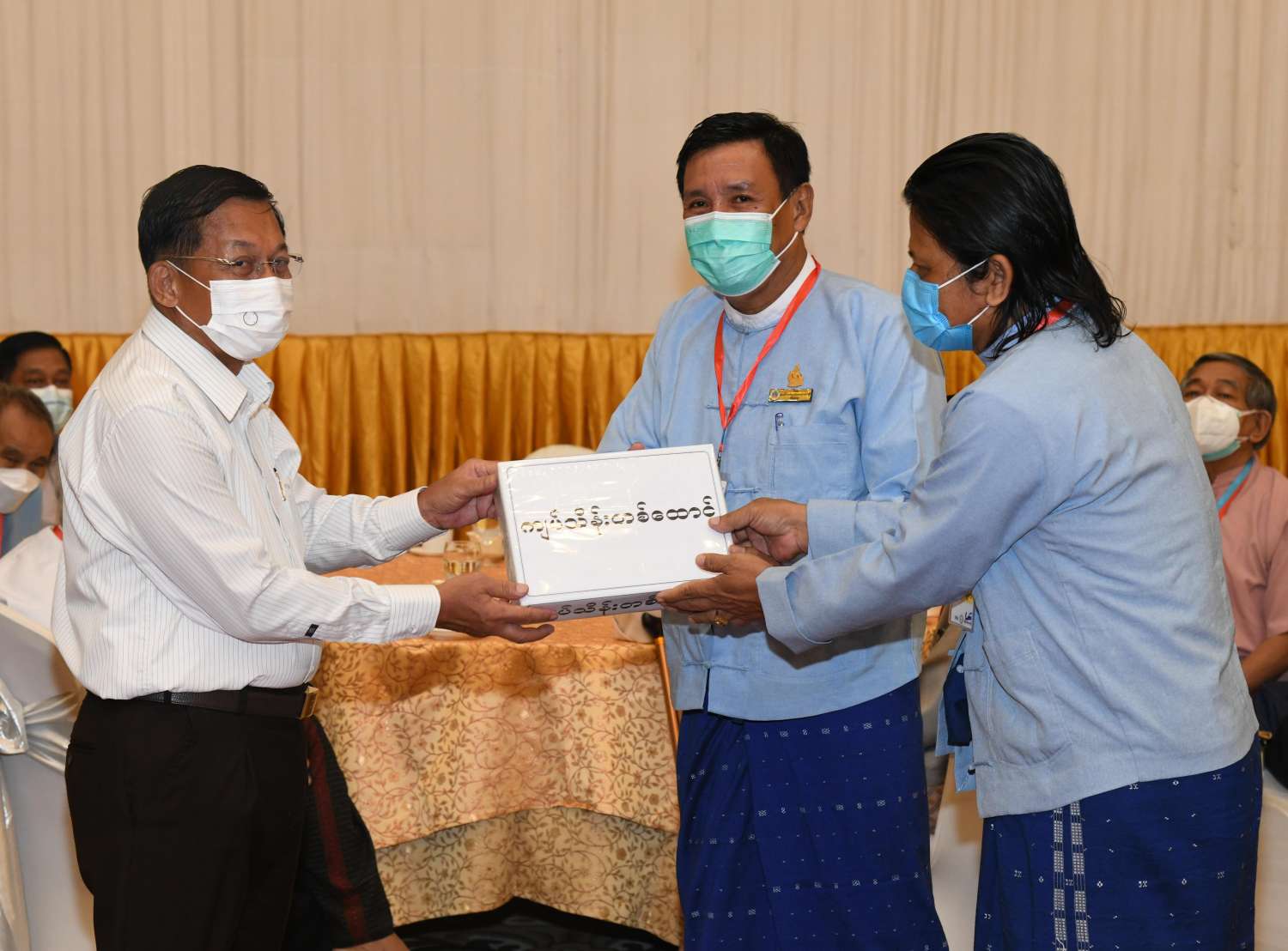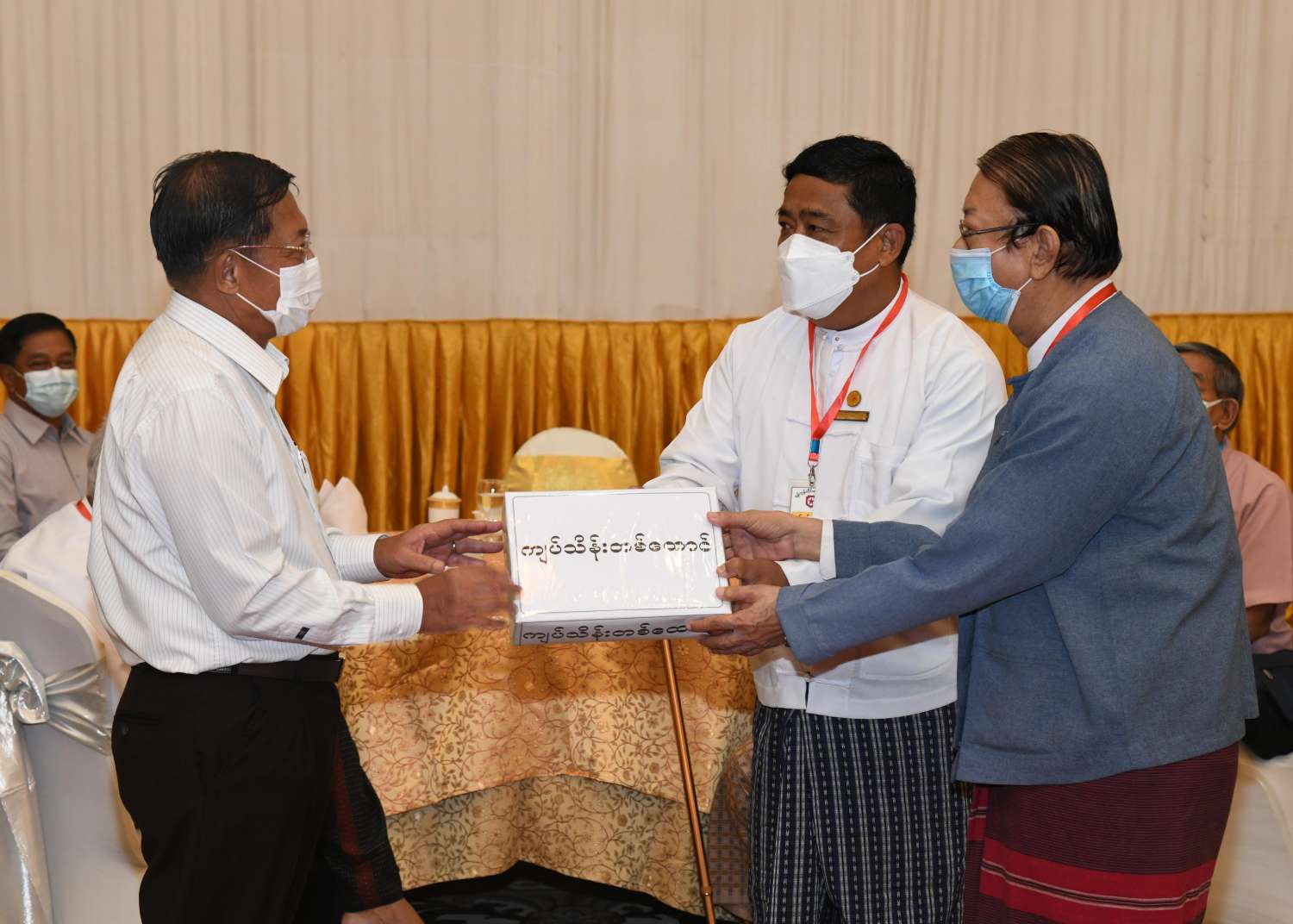 ထို့နောက် နိုင်ငံတော်စီမံအုပ်ချုပ်ရေးကောင်စီ ဥက္ကဋ္ဌ၊ နိုင်ငံတော် ဝန်ကြီးချုပ် က စာပေ၊ ရုပ်ရှင်၊ သဘင်၊ ဂီတ အနုပညာရပ်ဝန်းအသီးသီးအတွက် ရံပုံငွေ ကျပ်သိန်း ၄၀၀၀၊ ဆန်အိတ် ၁၀၀ ၊ ဆီပိဿာ ၅၀၀ နှင့် ပဲပိဿာ ၃၀၀ တို့အား ပေးအပ်ရာ စာပေနှင့် စာနယ်ဇင်းကဏ္ဍမှ အနုပညာရှင်များကိုယ်စား မြန်မာနိုင်ငံ စာရေးဆရာအသင်း အတွင်းရေးမှူး ဦးညွန့်တင်၊ တွဲဘက်အတွင်းရေးမှူး ဦးမျိုးထွန်း (မောင်စိမ်းနောင်-လယ်ဝေး) တို့ကလည်းကောင်း၊ မြန်မာနိုင်ငံရုပ်ရှင်ကဏ္ဍမှ အနုပညာရှင်များကိုယ်စား မြန်မာနိုင်ငံ ရုပ်ရှင်အစည်းအရုံး ဒုတိယဥက္ကဋ္ဌ ဦးအေးကြူလေး၊ အတွင်းရေးမှူး ဦးဇော်မြင့်ဦး တို့ကလည်းကောင်း၊ မြန်မာနိုင်ငံသဘင်ပညာရှင်များ ကိုယ်စား မြန်မာနိုင်ငံသဘင်အစည်း အရုံး အမှုဆောင် ဦးဌေးလွင်နှင့် တာဝန်ရှိသူတစ်ဦးကလည်းကောင်း၊ မြန်မာနိုင်ငံဂီတ ပညာရှင်များကိုယ်စား မြန်မာနိုင်ငံဂီတ အစည်းအရုံး(ဗဟို)မှ ယာယီအမှုဆောင်အဖွဲ့ ဥက္ကဋ္ဌ ဦးလွင်မြင့်နှင့် တာဝန်ရှိသူတစ်ဦးတို့က လည်းကောင်း လက်ခံရယူကြသည်။