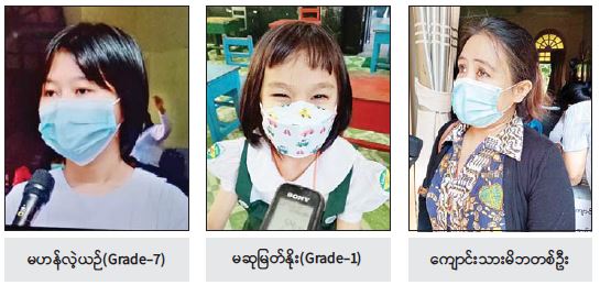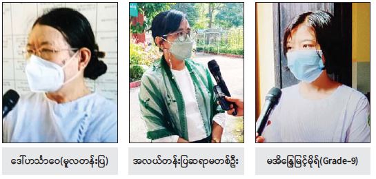 ဒီတစ်ခေါက်မှာ ကိုဗစ်ကာကွယ်ဆေး လည်း ထိုးထားတယ်ဆိုတော့ ရောဂါ ကူးစက်မှုကနည်းနည်း လျော့ကျသွားမယ် လို့ထင်ပါတယ်။ သမီးတို့က ပညာလိုလား သူတွေမို့ ကျောင်းကို မတက်မဖြစ်တက် ရမှာပဲ။ သမီးတို့ ကျောင်းပိတ်လိုက်တဲ့ အချိန်မှာ အတိုင်းအတာ တစ်ခုအထိ စာတွေ ပြတ်လပ်သွားခဲ့တယ်။ တချို့ဆို စိတ်ပျက်သွားတာမျိုးတွေ ဖြစ်နေကြ တယ်။ အဲဒါကြောင့် သမီးကတော့ ကျောင်းကို မဖြစ်မနေတက်တယ်။ သမီး စာတွေနဲ့ အဆက်မပြတ်ချင်ဘူး၊ ကျောင်း တွေ ပြန်ဖွင့်လိုက်တဲ့အတွက် ဆရာမတွေ၊ သူငယ်ချင်းတွေနဲ့ ပြန်တွေ့ပြီး ရင်းနှီးမှု တွေပြန်ရတဲ့အတွက် ဝမ်းသာပါတယ်။  အဲဒီအတွက် နိုင်ငံတော်အစိုးရကို အလွန် ကျေးဇူးတင်ပါတယ်ရှင့်။