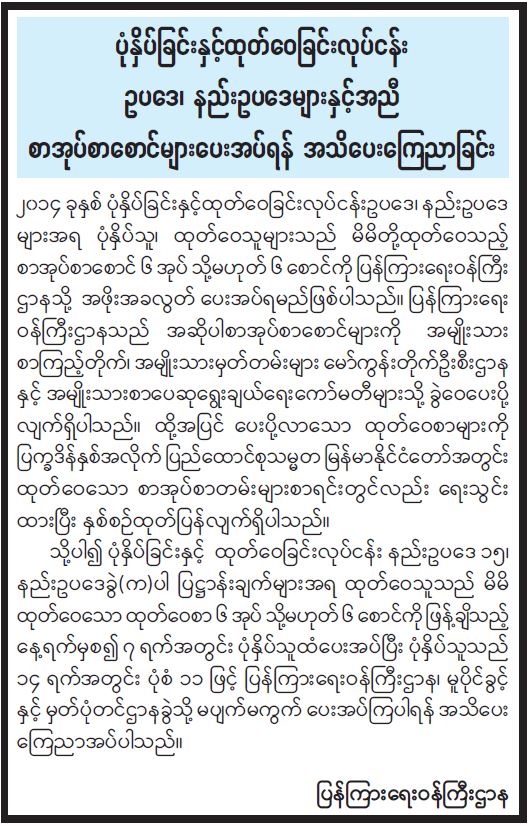 ပုံနှိပ်ခြင်းနှင့်ထုတ်ဝေခြင်းလုပ်ငန်း ဥပဒေ၊ နည်းဥပဒေများနှင့်အညီ စာအုပ်စာစောင်များပေးအပ်ရန် အသိပေးကြေညာခြင်း