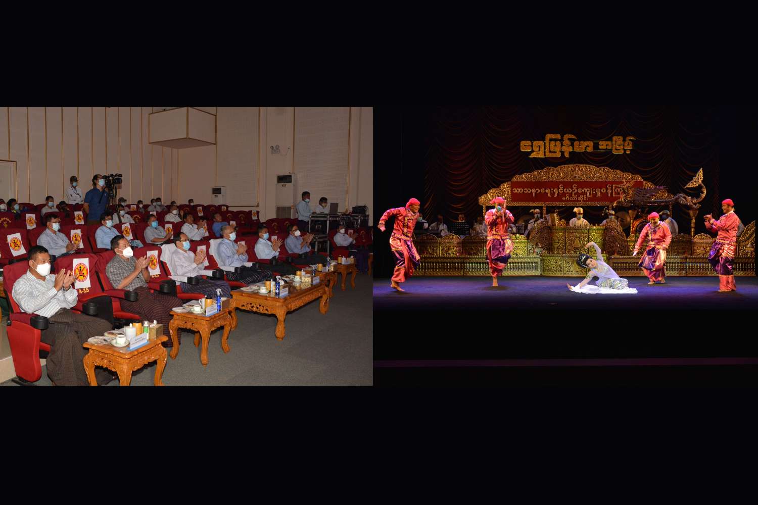 သာသနာရေးနှင့်ယဉ်ကျေးမှုဝန်ကြီးဌာနသည် ရိုးရာယဉ်ကျေးမှု အနုသုခုမအမွေအနှစ်များကို ရှာဖွေခြင်း၊ ဖော်ထုတ်ထိန်းသိမ်းခြင်းနှင့် တိုးတက်ပြန့်ပွားစေရန် ဆောင်ရွက်ခြင်းစသည့် လုပ်ငန်း တာဝန်များကို ဆောင်ရွက်လျက်ရှိပြီး ကိုဗစ် 19 ကာလအတွင်း အများပြည်သူများ စိတ်အပန်းပြေ စေရေးအတွက် မြန်မာ့ရိုးရာယဉ်ကျေးမှုများကို အခြေခံသည့် ဖျော်ဖြေရေး အစီအစဉ်များကို ဖော်ထုတ်ပြသရန် ရည်ရွယ်၍ နေပြည်တော်ရှိ အနုပညာဦးစီးဌာန လေ့ကျင့်ရေး ဇာတ်ရုံ၌ “ရွှေမြန်မာ” အငြိမ့်ခန်းအစီအစဉ်(၂)ကို ဇာတ်တိုက်လေ့ကျင့်လျက်ရှိရာ သာသနာရေးနှင့်ယဉ်ကျေးမှု ဝန်ကြီးဌာန ပြည်ထောင်စုဝန်ကြီး ဦးကိုကို၊ ရင်းနှီးမြှုပ်နှံမှုနှင့် နိုင်ငံခြားစီးပွားဆက်သွယ်ရေးဝန်ကြီး ဌာန ပြည်ထောင်စုဝန်ကြီး ဦးအောင်နိုင်ဦးတို့သည် ဒုတိယဝန်ကြီးများ ဖြစ်ကြသော ဦးအေးထွန်း၊ ဦးထွန်းအုံ တို့နှင့်အတူ ယနေ့နံနက်ပိုင်းတွင် ကြည့်ရှုစစ်ဆေးသည်။