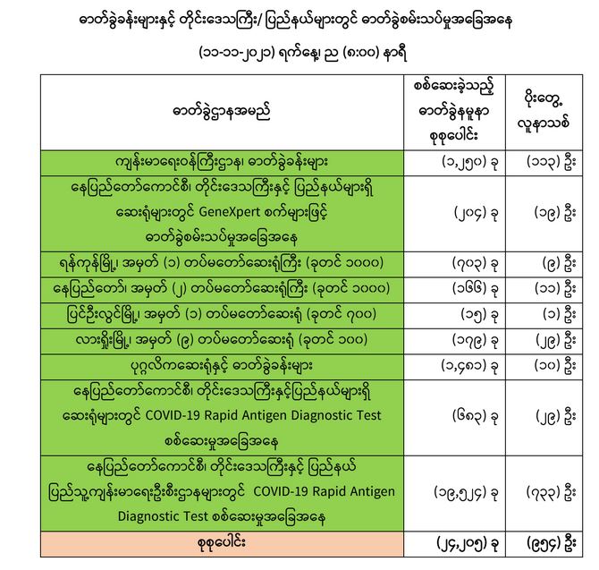 သို့ဖြစ်ပါ၍ ယနေ့အထိ ဓာတ်ခွဲနမူနာစုစုပေါင်း (၅,၁၃၅,၀၉၇)ခုအား စစ်ဆေးခဲ့ပြီး COVID-19 ဓာတ်ခွဲ အတည်ပြုလူနာ စုစုပေါင်း (၅၁၀,၇၂၅) ဦး ရှိပြီ ဖြစ်ပါသည်။