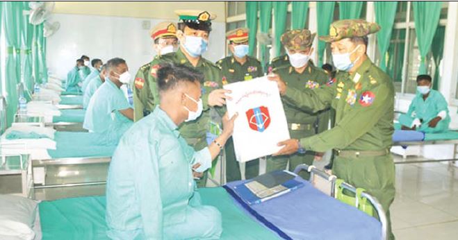 အလားတူ ကချင်ပြည်နယ်၊ မြစ်ကြီးနားမြို့ရှိ တပ်မတော်ဆေးရုံ၊ ရှမ်းပြည်နယ် (မြောက်ပိုင်း)၊ လားရှိုးမြို့ရှိ တပ်မတော်ဆေးရုံနှင့် ဧရာဝတီတိုင်းဒေသကြီး၊ ပုသိမ်မြို့ရှိ နယ်မြေခံဆေးတပ်ရင်းတို့၌ တက်ရောက်ကုသမှုခံယူလျက်ရှိသော သာသနာနွယ်ဝင် သီလရှင်များ၊ အရာရှိ၊ စစ်သည်၊ မိသားစုများနှင့် ဒေသခံပြည်သူများအား ယနေ့တွင် သက်ဆိုင်ရာတိုင်းစစ်ဌာနချုပ်များမှ တိုင်းမှူးများနှင့် တာဝန်ရှိသူများက သွားရောက် ကြည့်ရှု၍ တစ်ဦးချင်း၏ ရောဂါဖြစ်ပွားမှုများ၊ ဆေးကုသပေးထားမှုနှင့် ကျန်းမာရေးတိုးတက်မှုအခြေအနေများကို ရင်းရင်းနှီးနှီး မေးမြန်းအားပေးစကားပြောကြားပြီး အလှူငွေများနှင့် စားသောက်ဖွယ်ရာများ ပေးအပ်သည်။