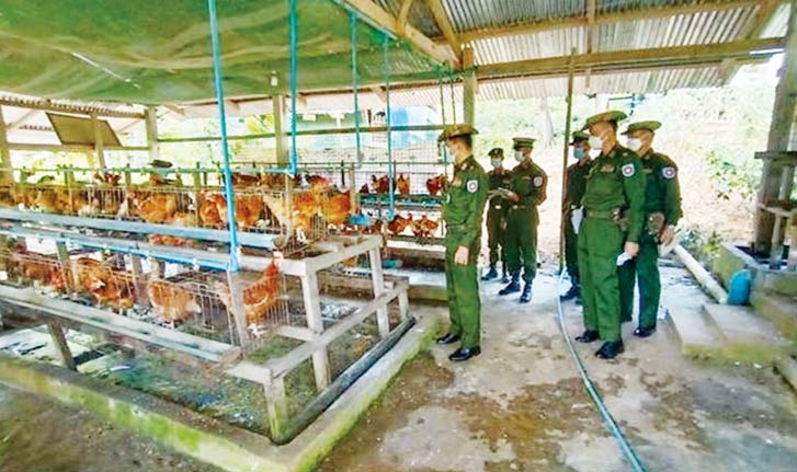 ထိုသို့ ဆောင်ရွက်ပေးလျက်ရှိရာ ယနေ့တွင် အနောက်ပိုင်းတိုင်းစစ်ဌာနချုပ် တိုင်းမှူး ဗိုလ်ချုပ် ထင်လတ်ဦးနှင့် အဖွဲ့ဝင်များသည် ဂွတပ်နယ်ရှိ နယ်မြေခံတပ်ရင်းများတွင် မွေးမြူထားရှိသော ဉစားကြက်မွေးမြူရေးခြံနှင့် DYL ဝက်မွေးမြူရေးခြံတို့ကို လည်းကောင်း၊ မကွေးတိုင်းဒေသကြီး ဝန်ကြီးချုပ် ဦးတင့်လွင်၊ အလယ်ပိုင်းတိုင်းစစ် ဌာနချုပ် တိုင်းမှူး ဗိုလ်ချုပ် ကိုကိုဦးနှင့် အဖွဲ့ဝင်များသည် မကွေးတိုင်းဒေသကြီး၊ မင်းဘူးခရိုင်အတွင်းရှိ စံပြစပါးစိုက်ခင်းတွင် “ခိုက်တိုဇမ်” ရွက်ဖြန်းအားဆေးအသုံးပြု၍ စိုက်ပျိုးထားရှိသည့် စပါးစိုက်ခင်းများကို လည်းကောင်း အသီးသီးသွားရောက်ကြည့်ရှု၍ တာဝန်ရှိသူများနှင့်တွေ့ဆုံကာ ကုန်ထုတ်လုပ်မှု လုပ်ငန်းများ ရာနှုန်းပြည့်ဆောင်ရွက်နိုင်ရေးနှင့် လိုအပ်သည်များ ပေါင်းစပ်ညှိနှိုင်းဆောင်ရွက် ပေးခဲ့ကြောင်း သတင်းရရှိသည်။