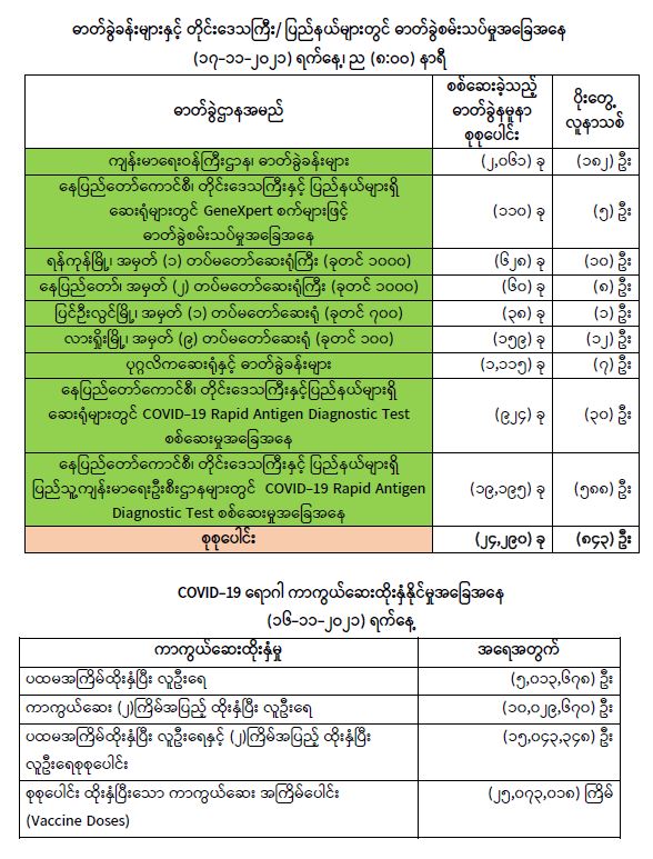 COVID-19 ရောဂါ ကာကွယ်ထိန်းချုပ်ရေးအတွက် တိုင်းဒေသကြီး/ပြည်နယ်များတွင် COVID-19 ရောဂါကာကွယ်ဆေးကို ဦးတည်အုပ်စုများ သတ်မှတ်၍ ထိုးနှံပေးလျက်ရှိရာ (၁၆-၁၁-၂၀၂၁) ရက်နေ့အထိ လူဦးရေ စုစုပေါင်း (၁၅,၀၄၃,၃၄၈) ဦးအား ထိုးနှံပေးပြီးဖြစ်၍ ကာကွယ်ဆေး နှစ်ကြိမ်အပြည့် ထိုးနှံပြီးစီးသူ (၁၀,၀၂၉,၆၇၀) ဦးနှင့် ပထမအကြိမ်ထိုးနှံပြီးစီးသူ (၅,၀၁၃,၆၇၈) ဦး ရှိပြီဖြစ်ပါသည်။ သို့ဖြစ်ပါ၍ (၁၆-၁၁-၂၀၂၁) ရက်နေ့အထိ မြန်မာနိုင်ငံတွင် COVID-19 ရောဂါ ကာကွယ်ဆေး အကြိမ်ရေ စုစုပေါင်း (၂၅,၀၇၃,၀၁၈) ကြိမ် ထိုးနှံပြီး ဖြစ်ပါသည်။