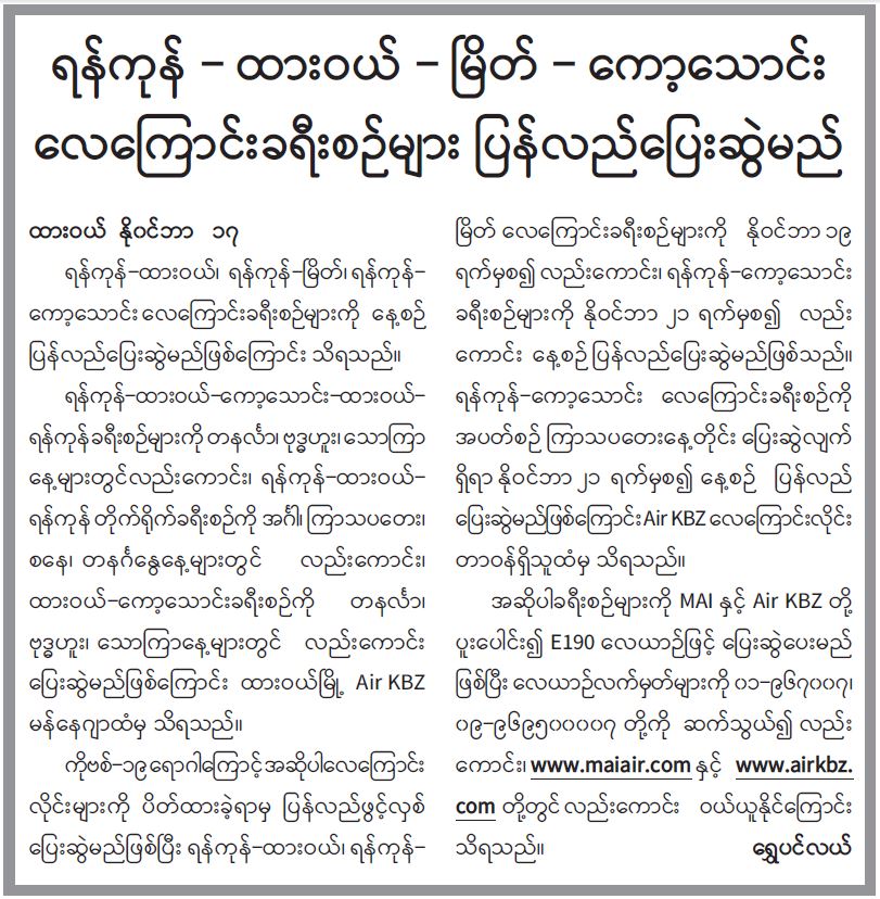 ရန်ကုန်- ထားဝယ်-မြိတ်-ကော့သောင်း လေကြောင်းခရိးစဉ်များ ပြန်လည်ပြေးဆွဲမည်