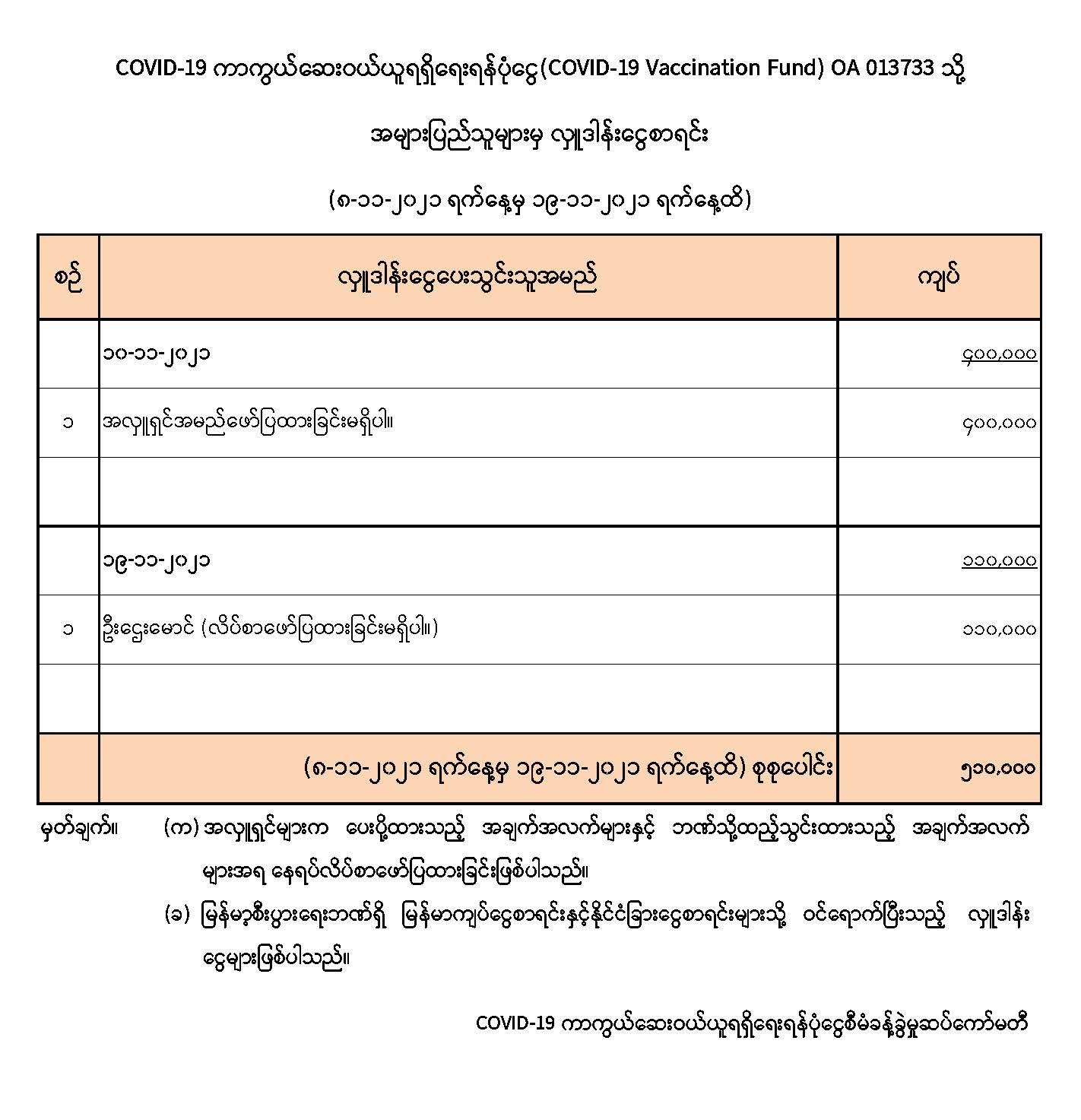 မြန်မာ့စီးပွားရေးဘဏ် (နေပြည်တော်)တွင် ဖွင့်လှစ်ထားရှိသော COVID-19 ကာကွယ်ဆေးဝယ်ယူ ရရှိရေးရန်ပုံငွေ (COVID-19 Vaccination Fund) မြန်မာကျပ်ငွေစာရင်း OA 013733 သို့ ၈-၁၁-၂၀၂၁ ရက်မှ ၁၉-၁၁-၂၀၂၁ ရက်အထိ ပြည်တွင်း / ပြည်ပ အလှူရှင်များမှ ထည့်ဝင် လှူဒါန်းငွေ စုစုပေါင်းမှာ ငွေကျပ် ၀ ဒသမ ၅၁၀ သန်း ဖြစ်သည်။ ၁၉-၁၁-၂၀၂၁ ရက်အထိ ရန်ပုံငွေစာရင်း၏ အခြေအနေမှာ အောက်ပါအတိုင်းဖြစ်သည်-