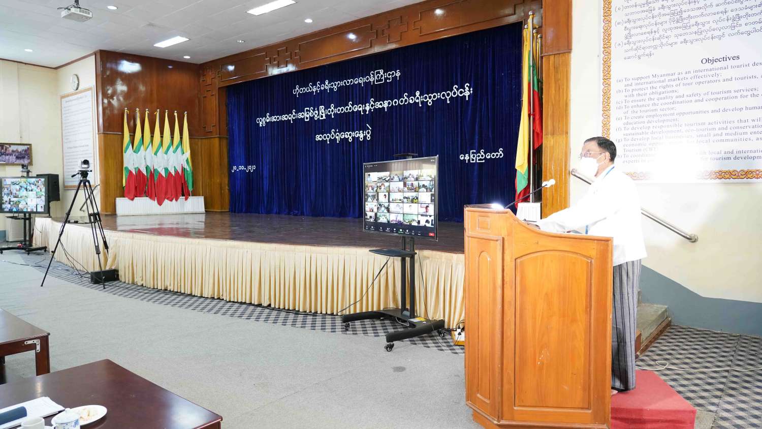 ဟိုတယ်နှင့် ခရီးသွားလာရေးဝန်ကြီးဌာန၊ ပြည်ထောင်စုဝန်ကြီး ဒေါက်တာဌေးအောင်သည် ယနေ့ နံနက်ပိုင်းတွင် ဝန်ကြီးဌာန ကျောက်စိမ်းခန်းမ၌ ဗီဒီယိုကွန်ဖရင့်စနစ်ဖြင့် ကျင်းပသည့် “လူ့စွမ်းအားအရင်းအမြစ်ဖွံ့ဖြိုးတိုးတက်ရေးနှင့် အနာဂတ်ခရီးသွား လုပ်ငန်း အလုပ်ရုံဆွေးနွေးပွဲ” သို့ တက်ရောက်သည်။