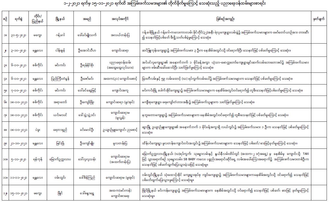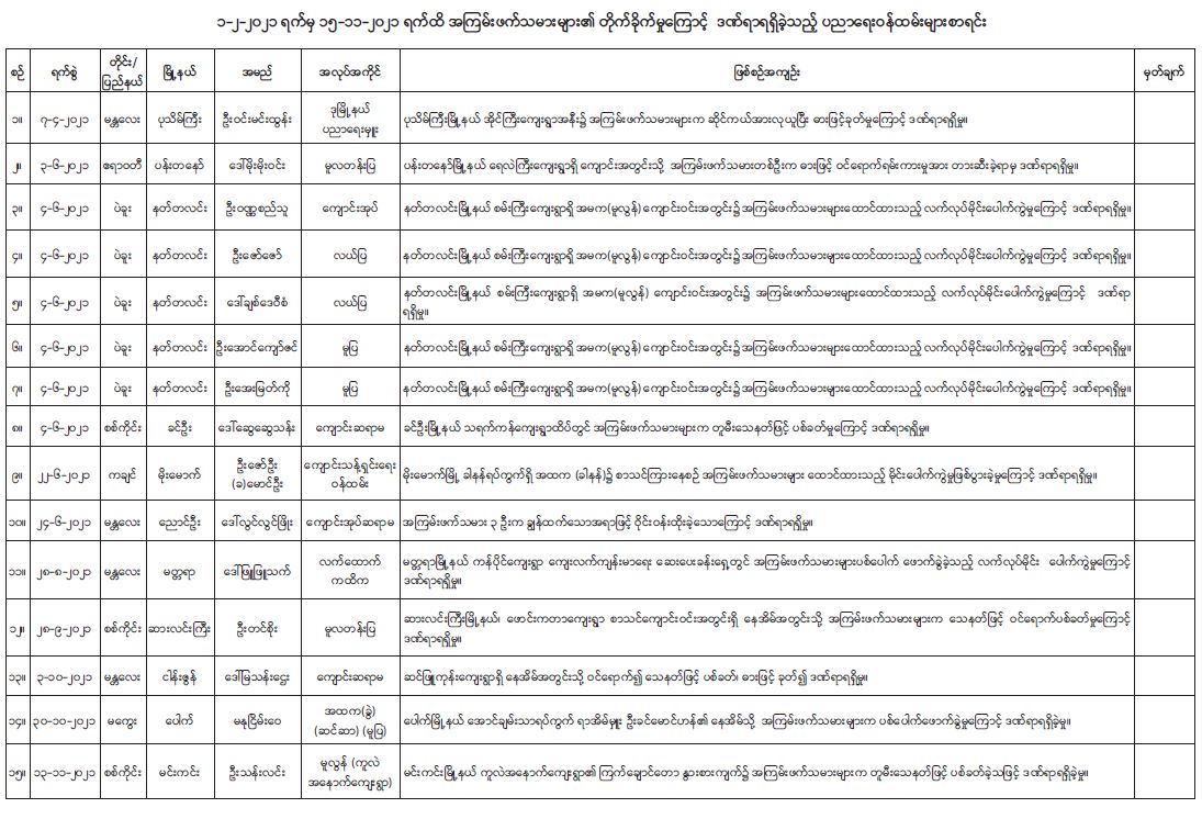 ထိုသို့ နိုင်ငံတော်နှင့် ပြည်သူများ၏ ကျန်းမာရေးကဏ္ဍ မြှင့်တင်ရေး ဆိုင်ရာများကို အစိုးရ၊ တပ်မတော်၊ ကျန်းမာရေးဝန်ထမ်းများနှင့် ပြည်သူများက ဟန်ချက်ညီညီ ပူးပေါင်းဆောင်ရွက်နေမှုများအပေါ် မလိုလား သည့် အကြမ်းဖက် အုပ်စုများဖြစ်သော CRPH ၊NUG၊ PDF စသည့်အဖွဲ့အစည်းများက နိုင်ငံ့အကျိုး တာဝန်ထမ်းဆောင်နေ သော ကျန်းမာရေးဝန်ထမ်းများကို အကြောင်းမဲ့ ရက်စက်စွာ သတ်ဖြတ်ခဲ့ခြင်း များလုပ်ဆောင်ခဲ့ခြင်းကြောင့် ၂၀၂၁ ခုနှစ်၊ ဖေဖော်ဝါရီ ၁ ရက်နေ့မှ နိုဝင်ဘာလ ၁၅ ရက်နေ့အထိ ကျန်းမာရေးဝန်ထမ်း ၃ ဦးသေဆုံးခဲ့ရပြီး ၈ ဦး ဒဏ်ရာရခဲ့မှုများကို ဖော်ပြပါအတိုင်းတွေ့ရှိရသည်-