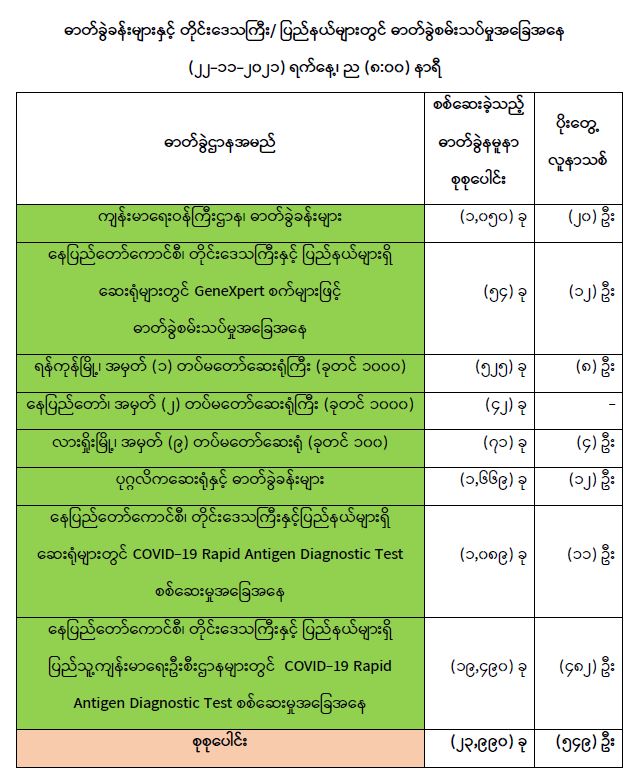 သို့ဖြစ်ပါ၍ ယနေ့အထိ ဓာတ်ခွဲနမူနာစုစုပေါင်း (၅,၃၉၅,၈၀၀) ခုအား စစ်ဆေးခဲ့ပြီး COVID-19 ဓာတ်ခွဲအတည်ပြုလူနာ စုစုပေါင်း (၅၁၈,၄၇၁) ဦး ရှိပြီ ဖြစ်ပါသည်။