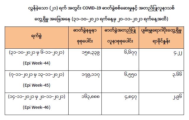 •         ကျန်းမာရေးဝန်ကြီးဌာနအနေဖြင့် COVID-19 ရောဂါကူးစက်ဖြစ်ပွားမှု အခြေအနေများအား ကူးစက်ရောဂါစောင့်ကြပ်ကြည့်ရှုရေး ရက်သတ္တပတ်အလိုက် ဓာတ်ခွဲနမူနာရယူစစ်ဆေးမှု၊ ဓာတ်ခွဲအတည်ပြုလူနာတွေ့ရှိရမှုနှင့် ရောဂါပိုးတွေ့ရှိမှုနှုန်း အခြေအနေများအား စောင့်ကြပ် ကြည့်ရှုလျက်ရှိရာ အပတ်စဉ် (၄၄) ၊ အပတ်စဉ် (၄၅) နှင့် အပတ်စဉ် (၄၆) တို့ကို နှိုင်းယှဉ် ချက်အရ ဓာတ်ခွဲအတည်ပြုလူနာနှင့် ပျမ်းမျှရောဂါပိုးတွေ့ရှိမှုနှုန်းများမှာ အပတ်စဉ်အလိုက် လျော့နည်းကျဆင်းလာကြောင်း တွေ့ရှိရသဖြင့် ရောဂါကူးစက်မှု ဆက်လက်လျော့နည်းလာ စေရေးအတွက် ကျန်းမာရေးဝန်ကြီးဌာနမှ ဆောင်ရွက်လျက်ရှိသော ရောဂါ ကာကွယ်၊ ထိန်းချုပ်၊ ကုသရေး လုပ်ငန်းများတွင် ပြည်သူလူထုအနေဖြင့် မိမိတို့ကဏ္ဍအလိုက် ယခုထက် ပိုမို ပူးပေါင်း ပါဝင်ဆောင်ရွက်ကြရန် တိုက်တွန်း နှိုးဆော်အပ်ပါသည်။
